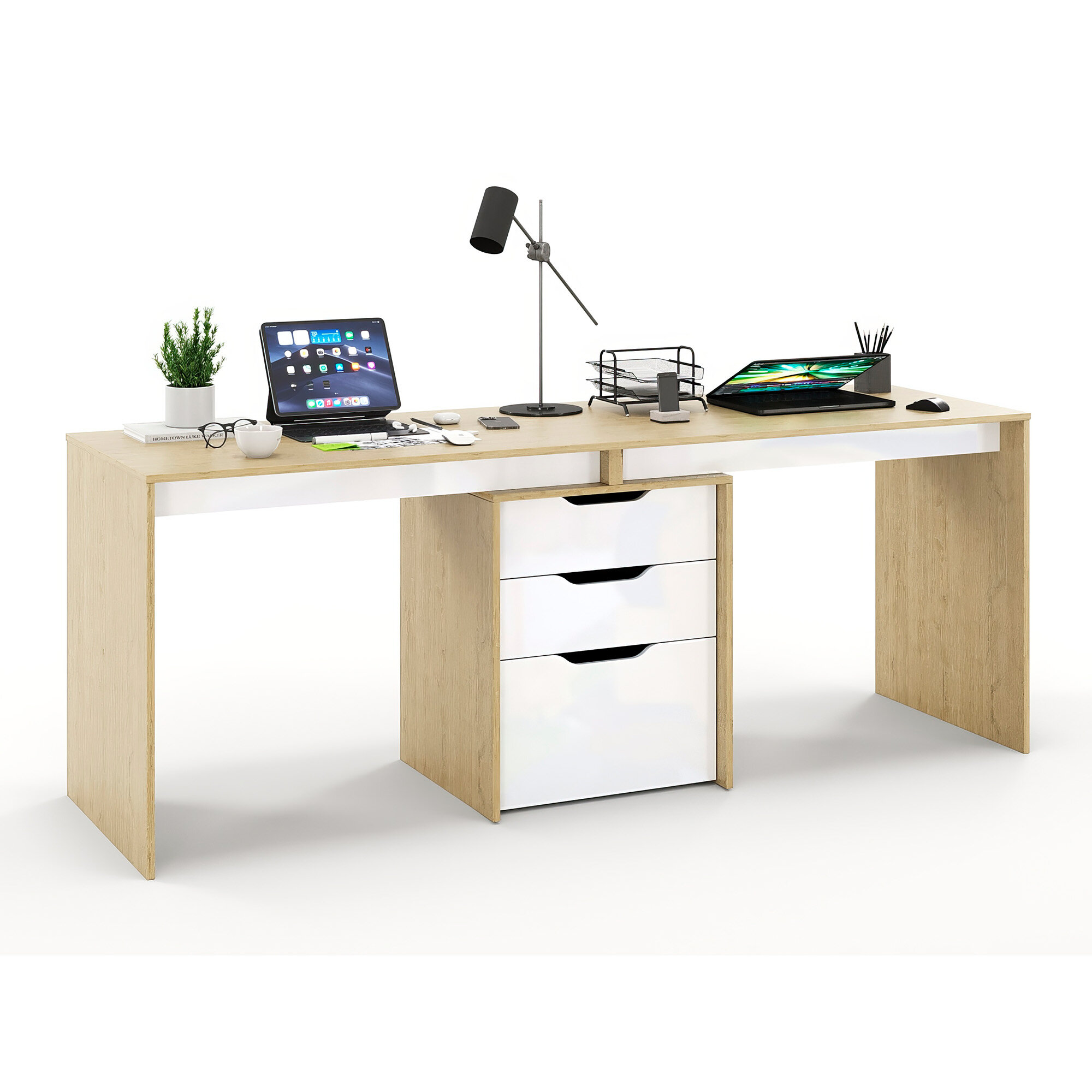 Компьютерный стол для двоих, двойной, с тумбой, с ящиками Grand Лаворо 200х60х75 см (Анкор белый/Дуб Аризона)