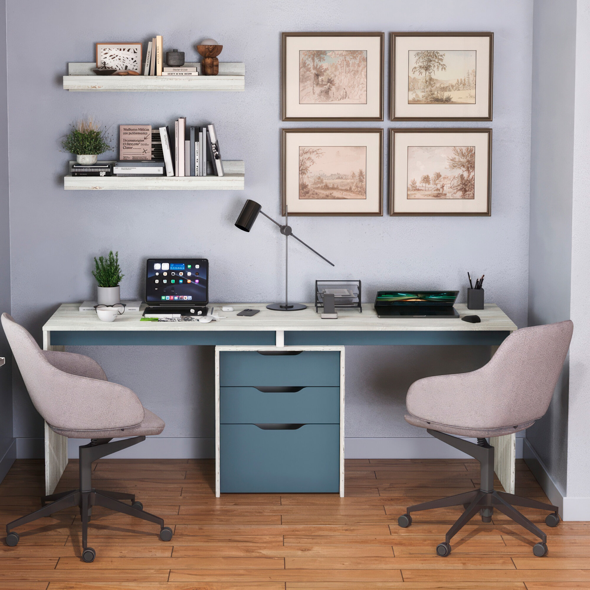 Компьютерный стол для двоих, двойной, с тумбой, с ящиками, для офиса, для детской, Есэндвич grand Лаворо 180х75х50 см (Анкор светлый/Вулканический серый)