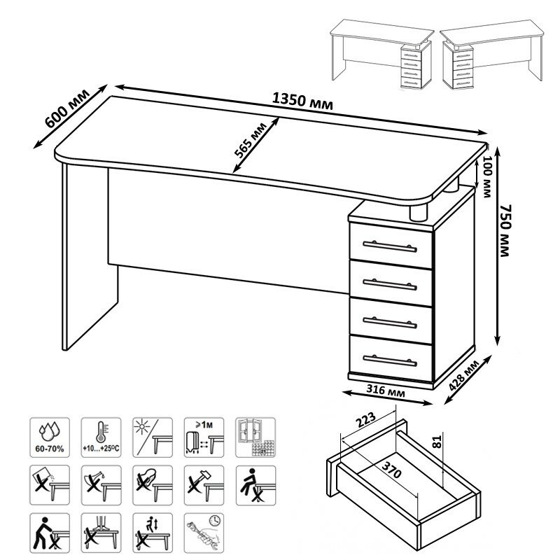 | Дополнительная информация | края столешницы спереди имеют эргономичный изгиб, имеет универсальную сборку, что позволяет расположить тумбу как справа, так и слева, хромированные опоры |