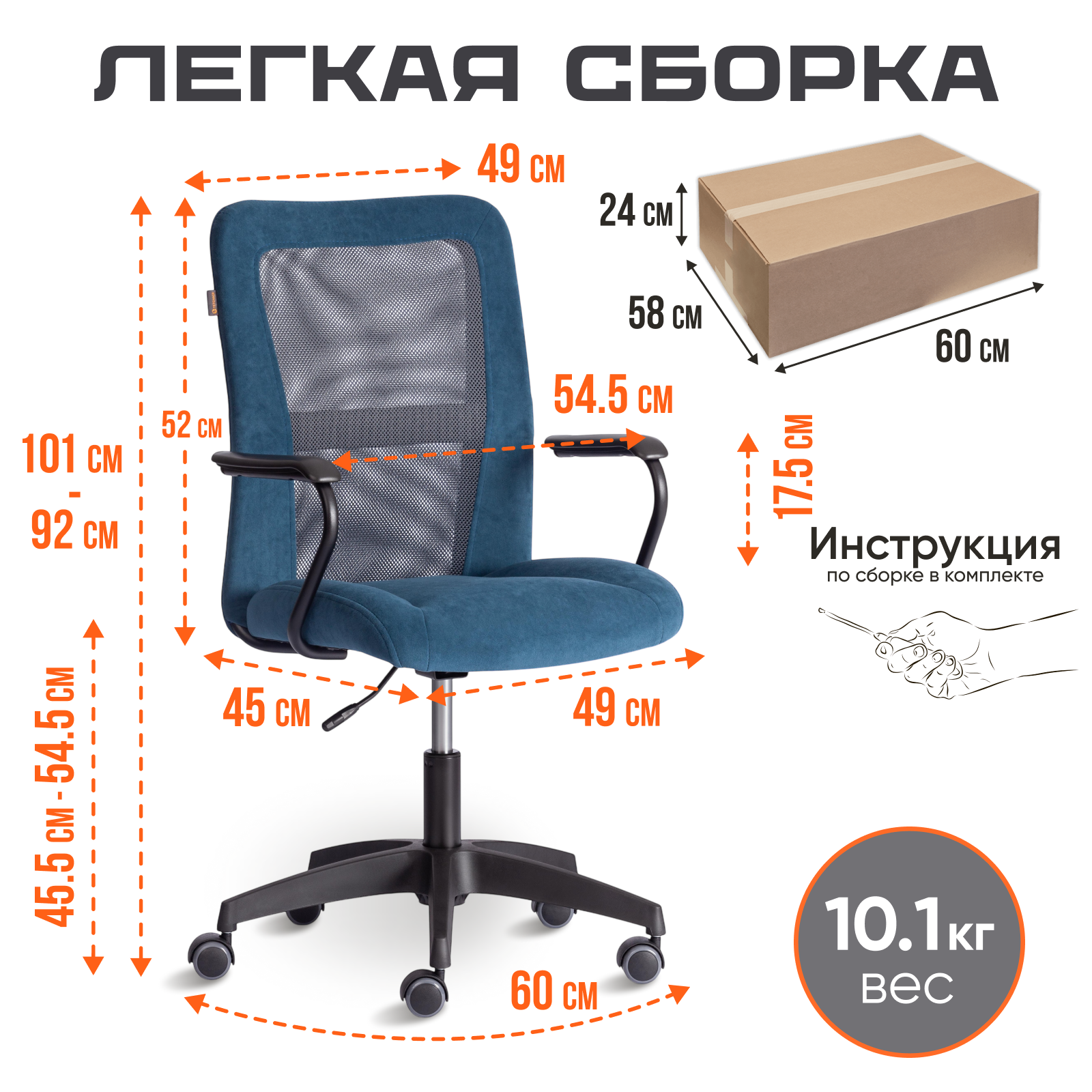 + Металлическая пластина, которую по инструкции нужно привинчивать к днищу сиденья для того, чтобы его установить на газлифт была УЖЕ ПРИВИНЧЕНА, отчего сборка оказалась почти мгновенная: воткнуть 5 колёс, установить газлифт в крестовину, насадить на газ лифт сиденье. Всё. Справится даже женщина. + Обивка очень приятная на ощупь, матовая, имитация кожи. Сколько прослужит не ясно.. время покажет. + Внешний вид очень презентабельный, кресло выглядит очень "импортно" в хорошем смысле слова + Размеры крайне компактные, кресло действительно занимает минимум места. |