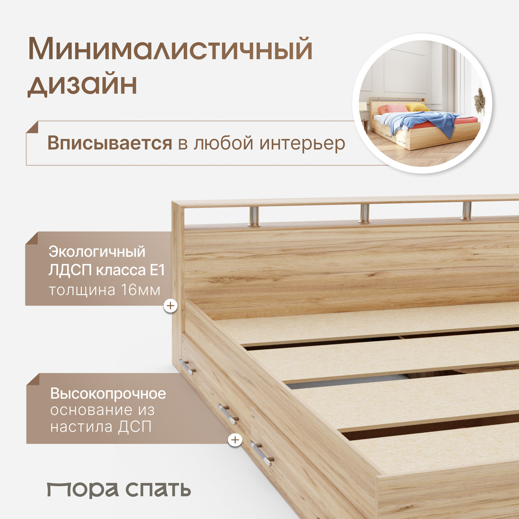 СохранитьКровать двуспальная Пора Спать Арина с ящиками и основанием ДСП, Дуб Крафт, спальное место: 200х140 см, габариты: 220х147 см интересное: