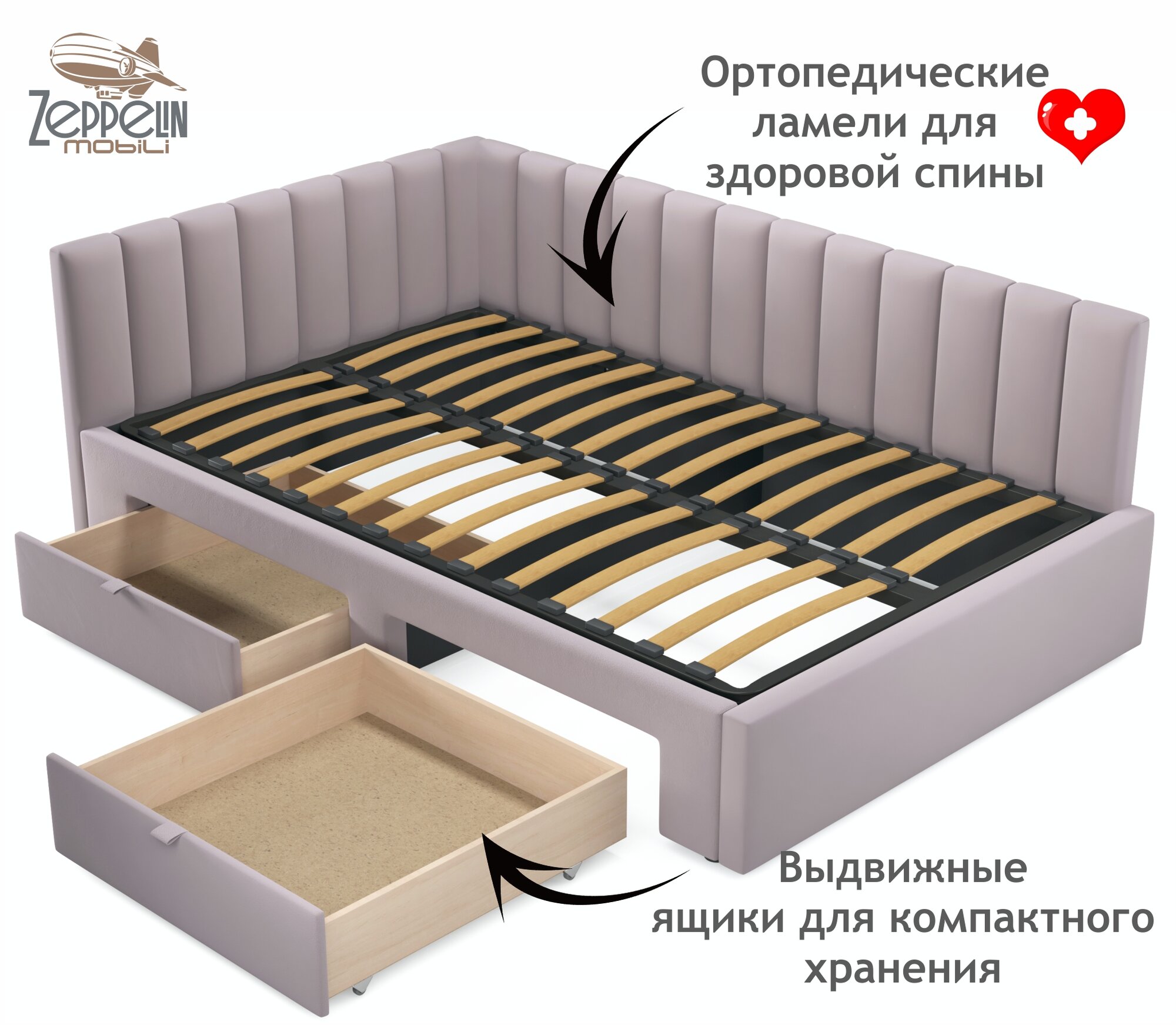 Кровать угловая Milena Zeppelin 120х200 маренго с ящиками, из велюра, с ортопедическими ламелями