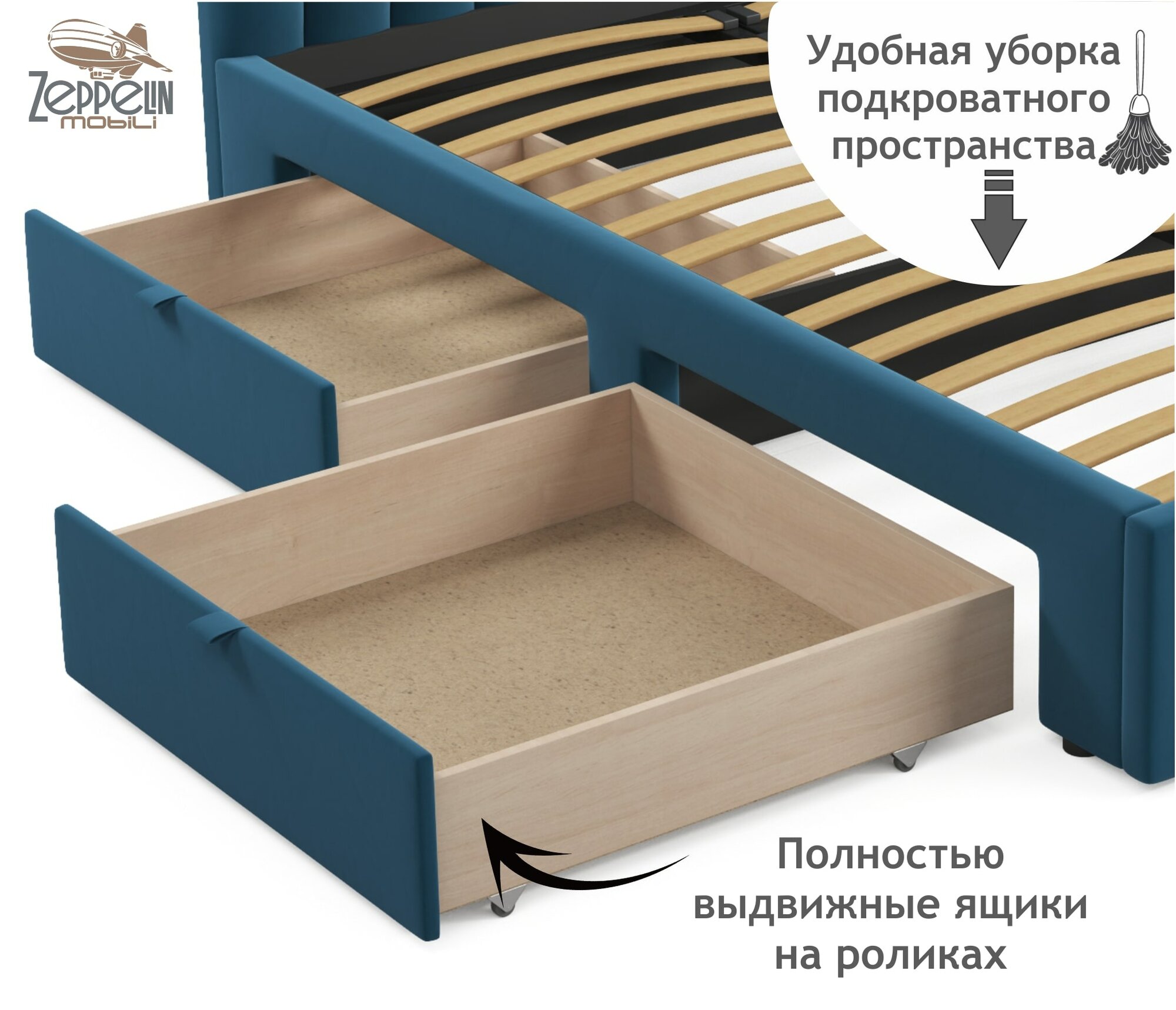 Кровать Milena Zeppelin 120х200 синяя с ящиками, из велюра, с ортопедическими ламелями