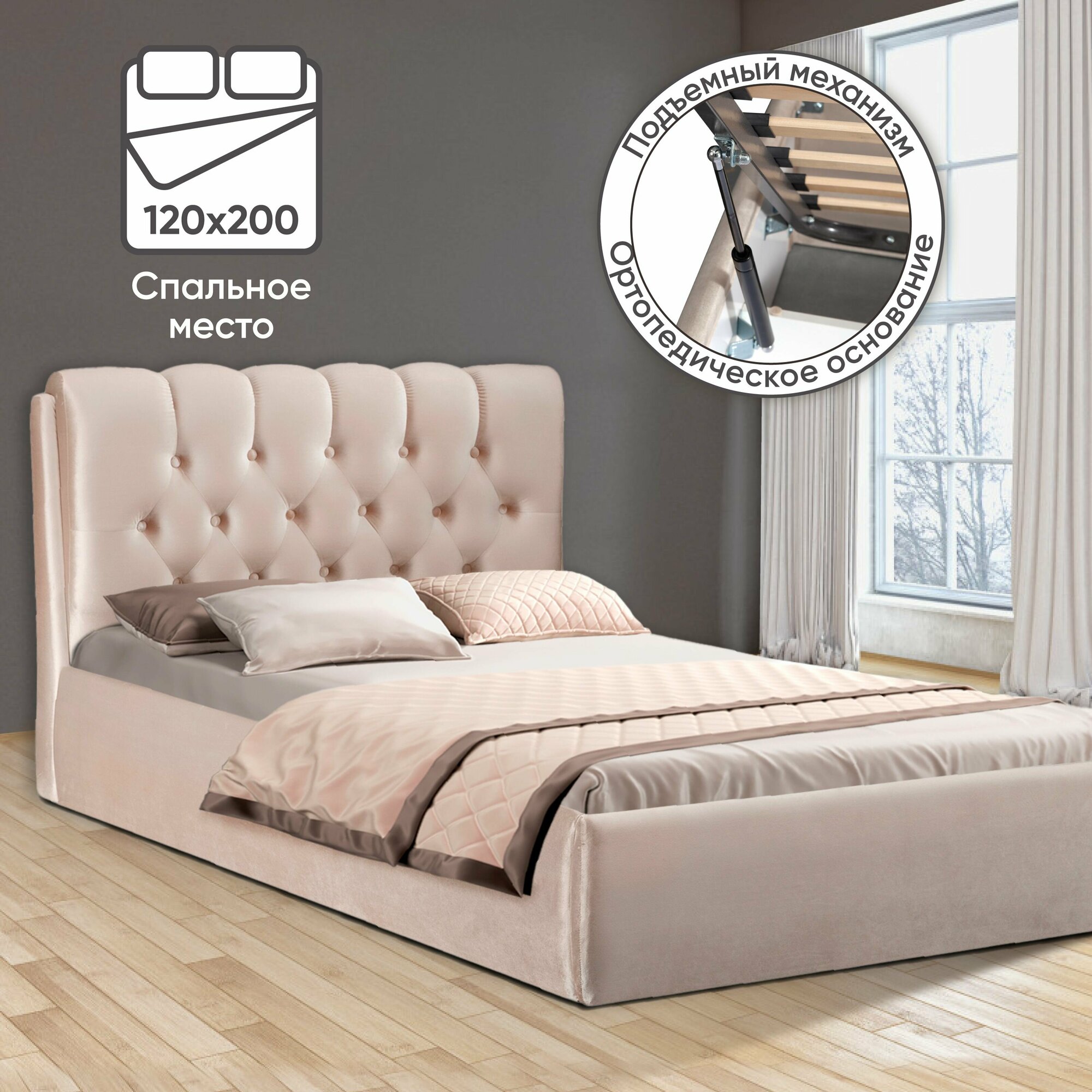 Полутороспальная кровать 120х200 см с подъемным механизмом Империя для дома и спальни, бархат бежевый, Ами Мебель