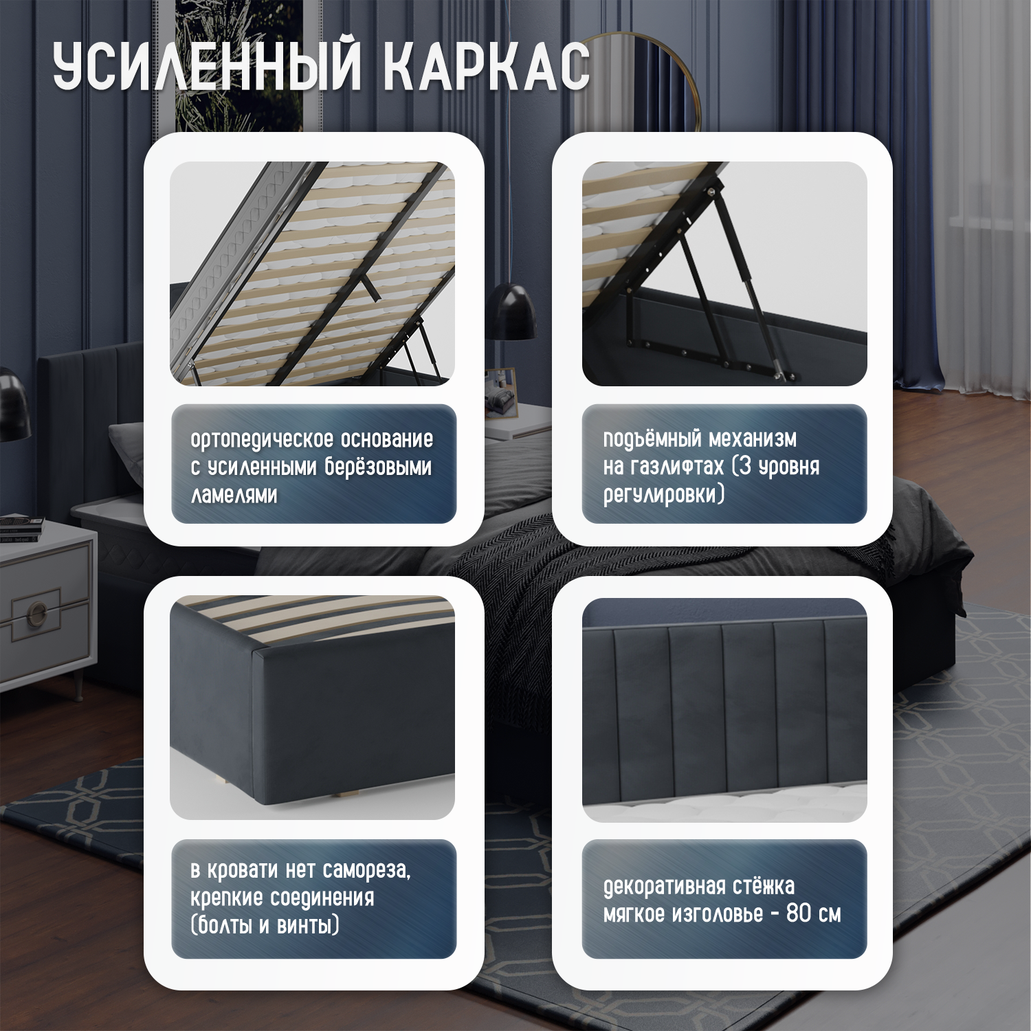 | Особенности | мягкое изголовье, основание под матрас, с подъемным механизмом, с ящиком для белья |
