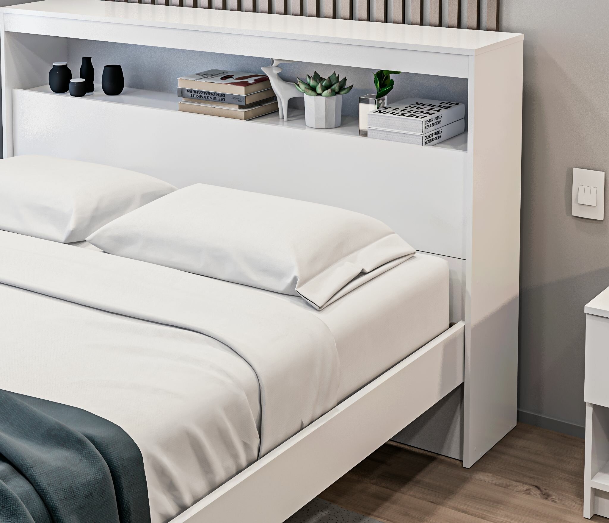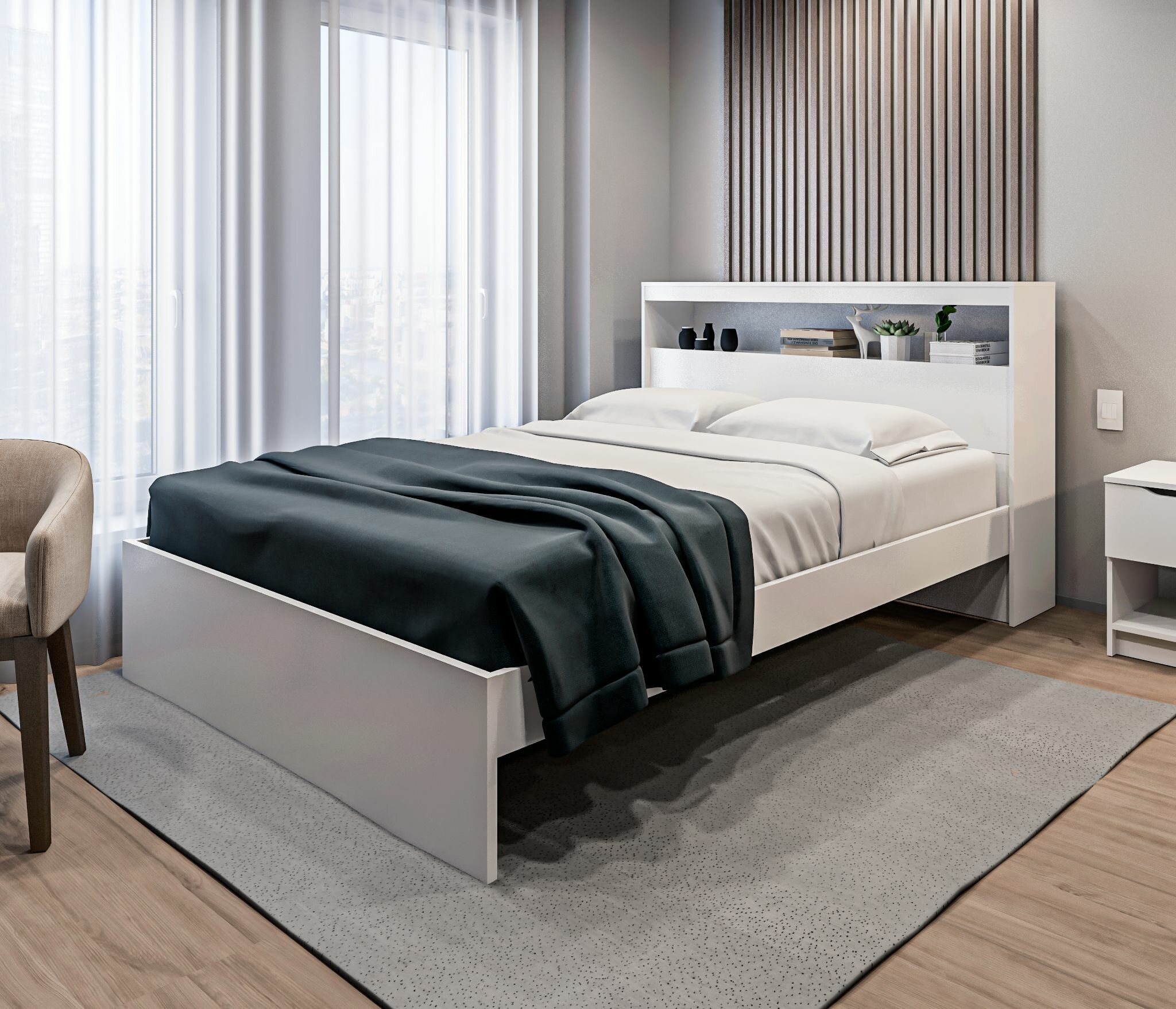 Двуспальная кровать столплит Бруклин СБ-3356 с основанием, без матраса, с полкой, нишей для белья, Белый 169х110х230см интересное: