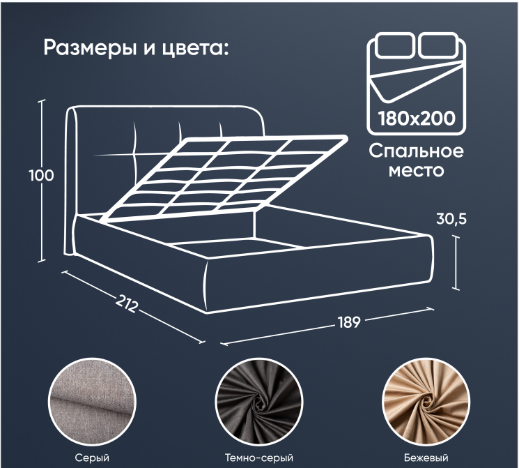 | Особенности | мягкое изголовье, с изножьем, с подъемным механизмом, с ящиком для белья, усиленная конструкция |