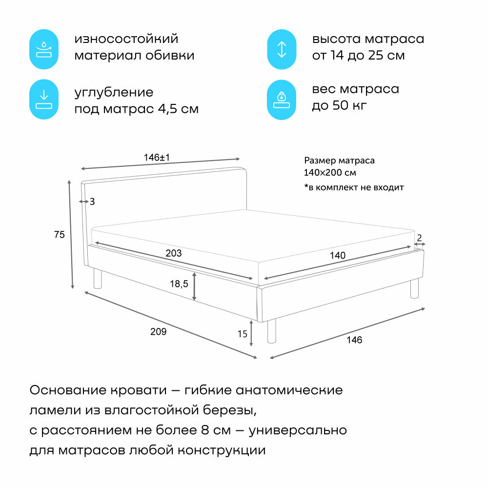 Двуспальная кровать buyson BuyStyle 200х140 см, серо-синий, микровелюр