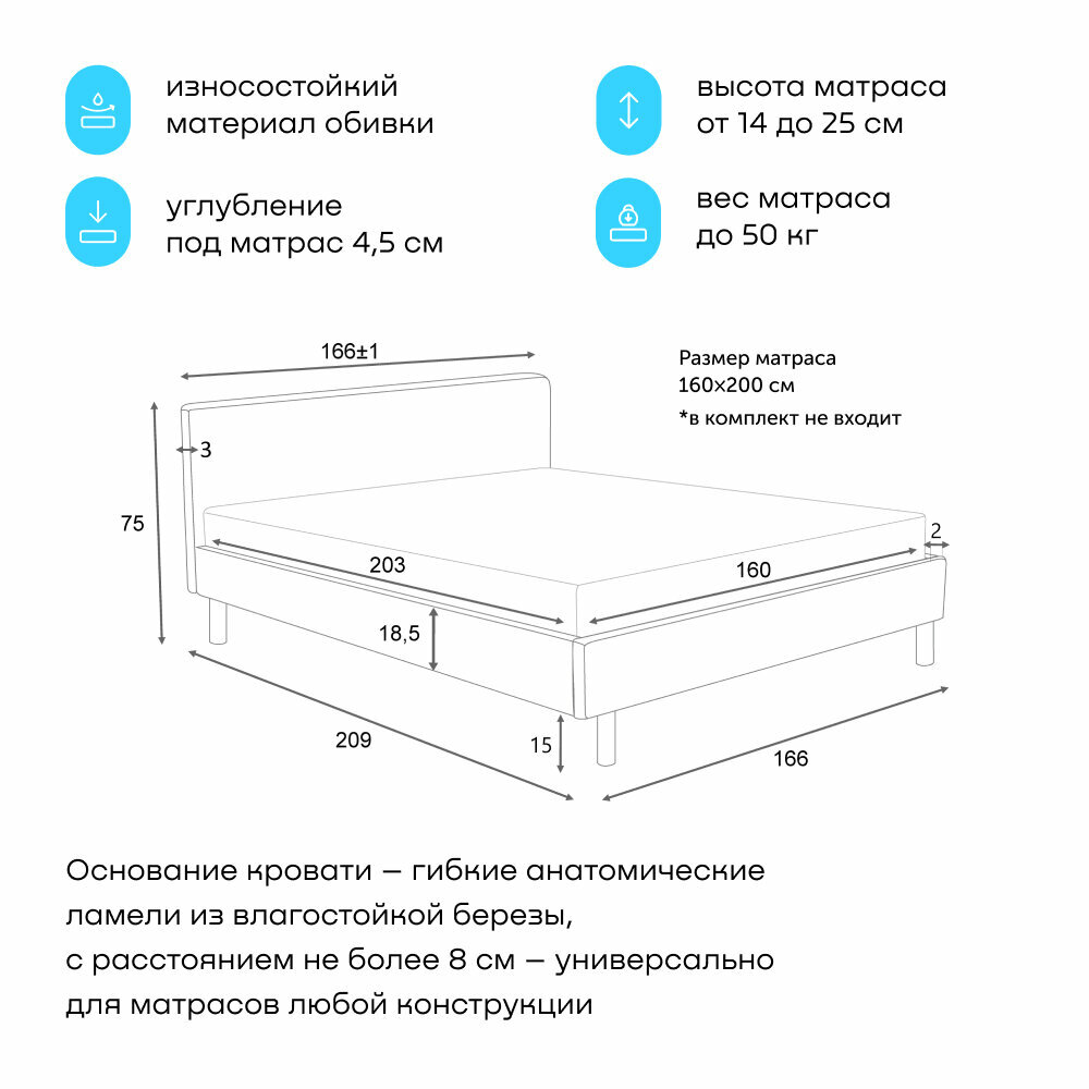 Двуспальная кровать buyson BuyStyle 200х160 см, серо-синий, микровелюр
