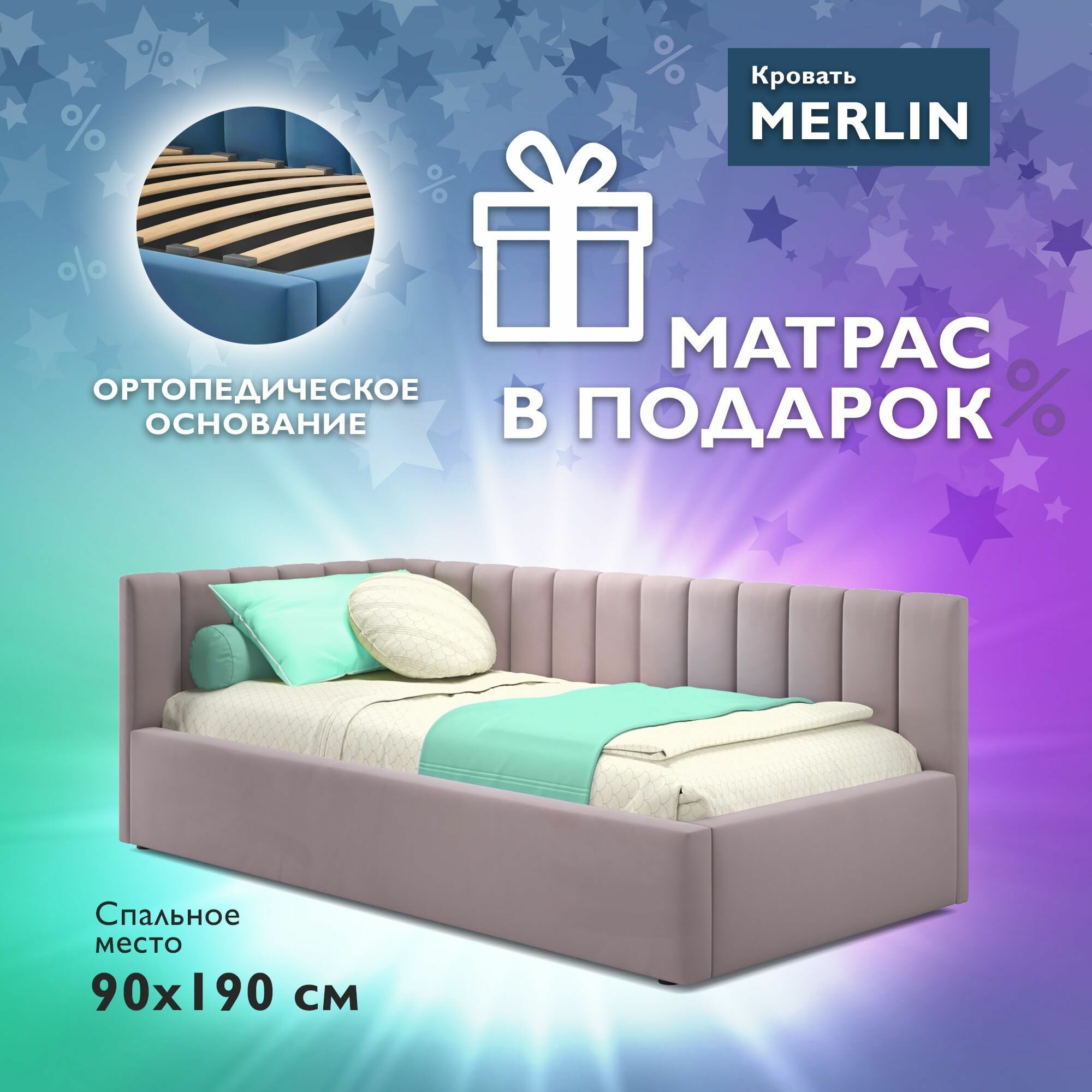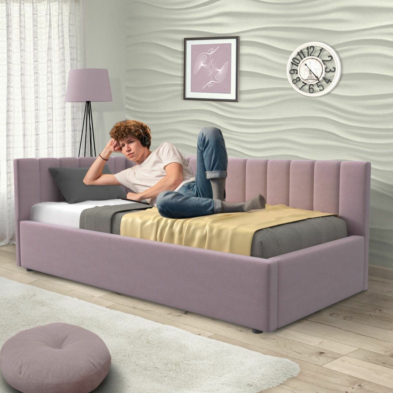 Кровать 90х190 односпальная с матрасом, угловая тахта с мягкой спинкой "MERLIN-CEYLON" детская, для подростков, диван