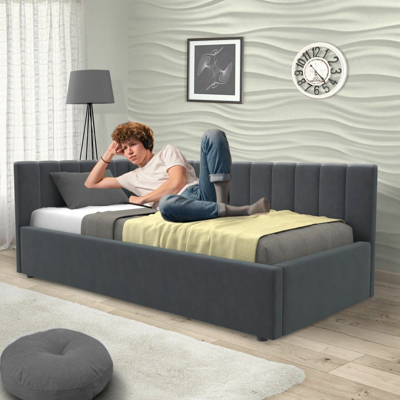 СохранитьКровать 90х190 односпальная с матрасом, угловая тахта с мягкой спинкой "MERLIN-GRAFIT" детская, для подростков, диван интересное: