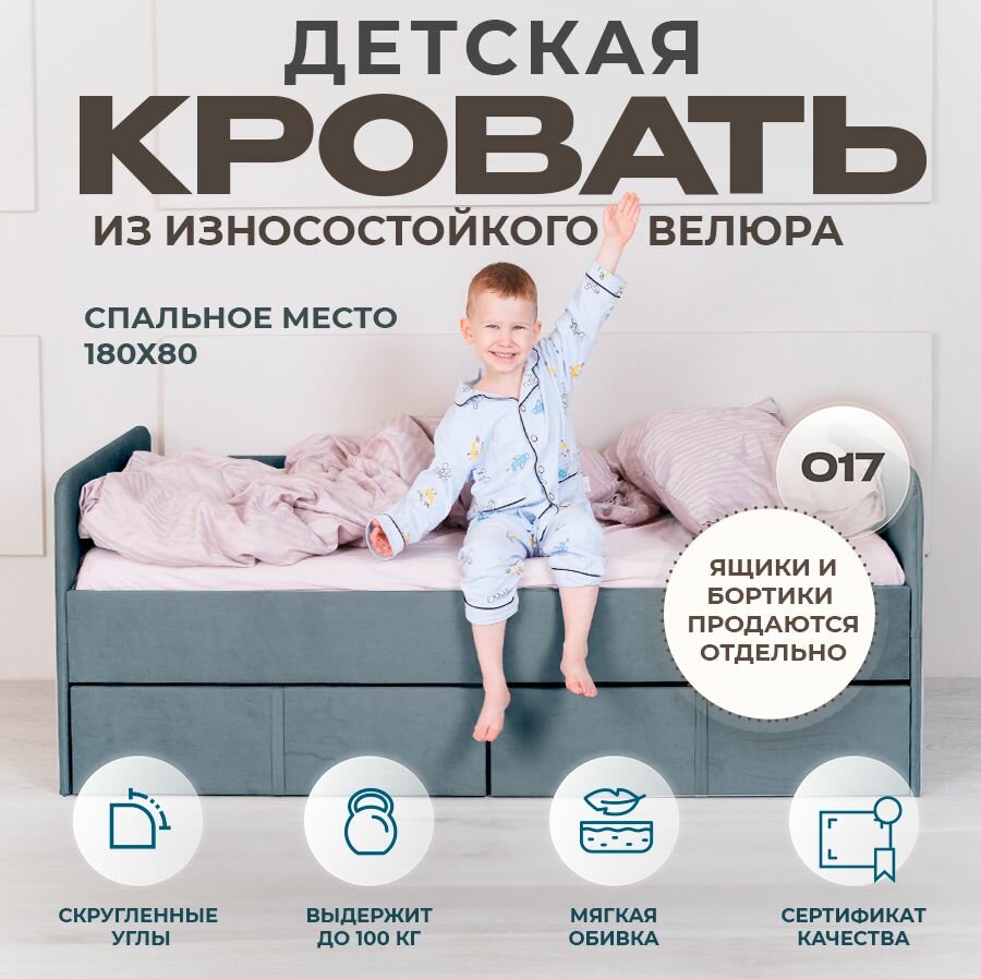 Кровать детская подростковая односпальная 180х80 Серо-синий с двумя ящиками и бортиком в комплекте