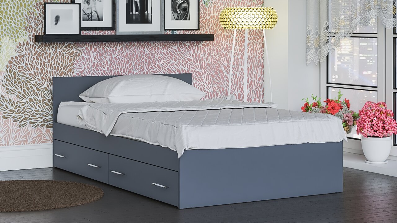 Кровать с ящиками для белья Мори 1200 цвет графит, ШхГхВ 123,5х203,5х70 см, сп. м. 1200х2000 мм, без матраса, основание есть