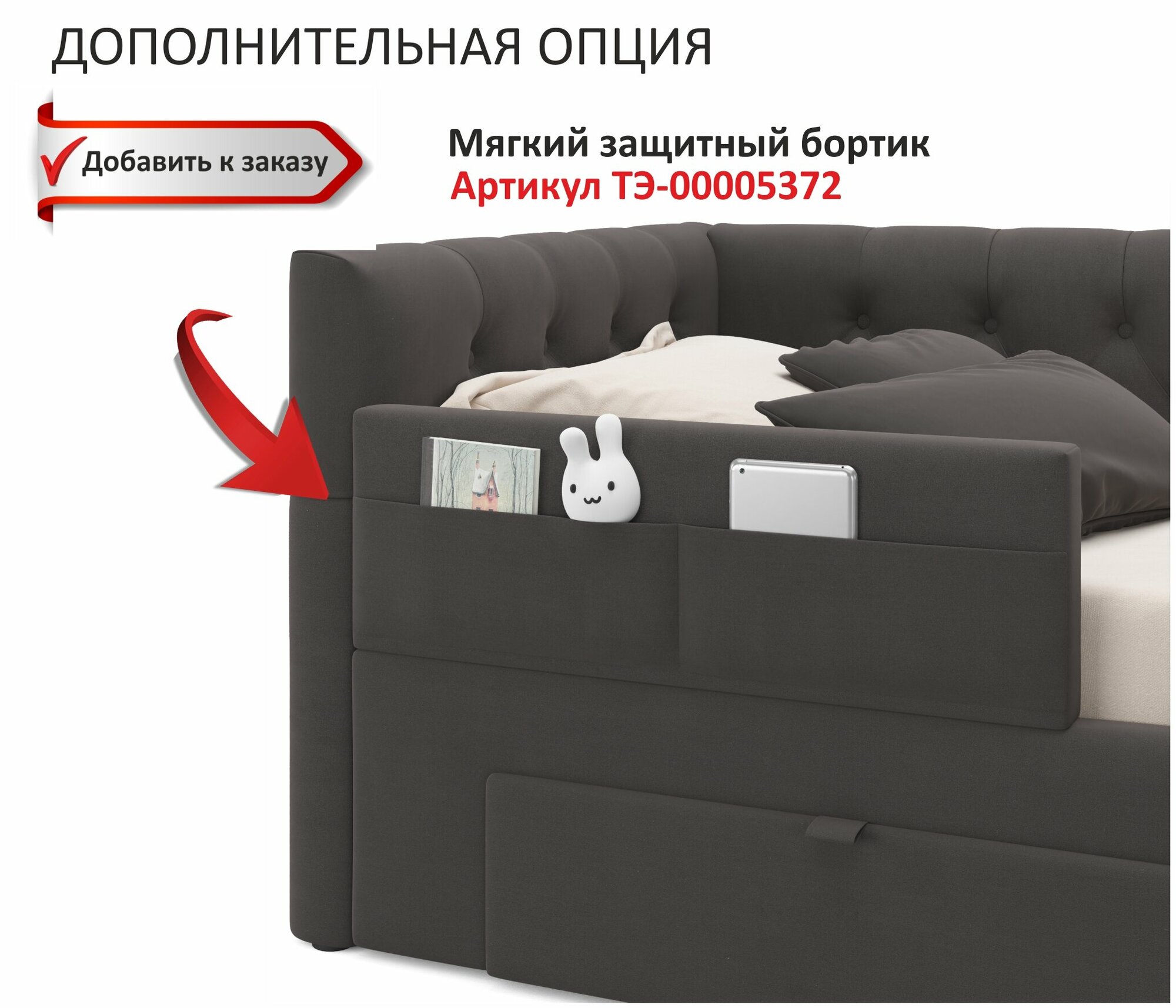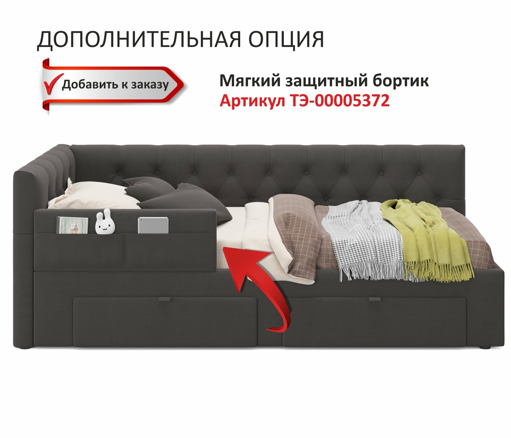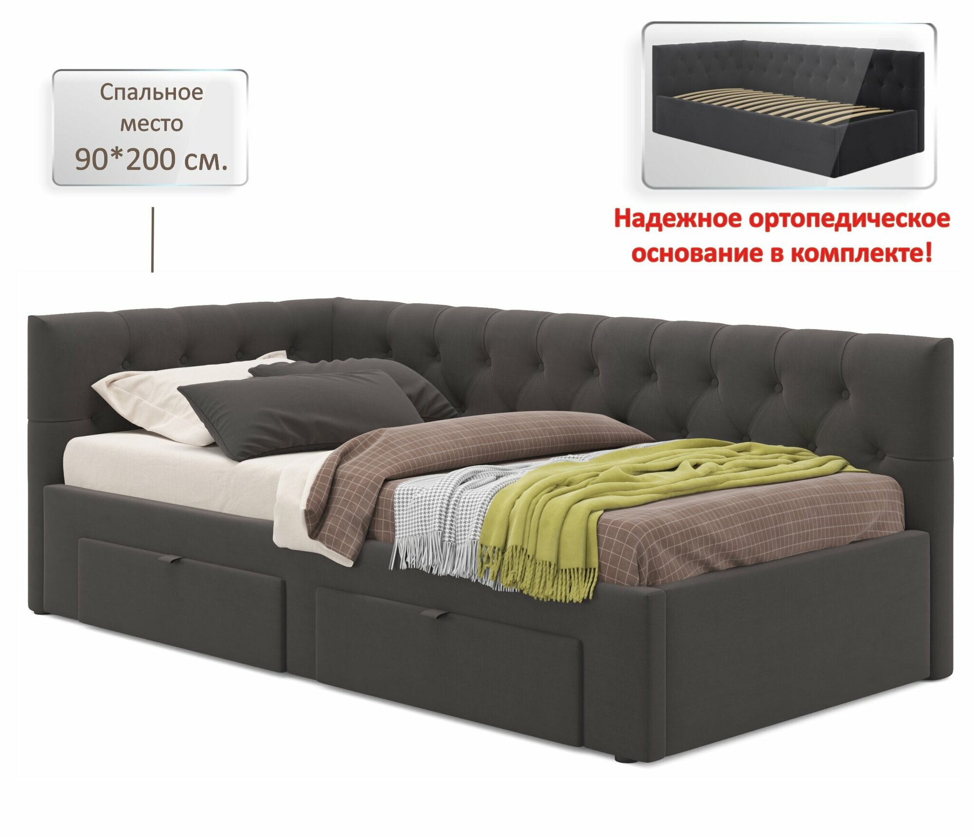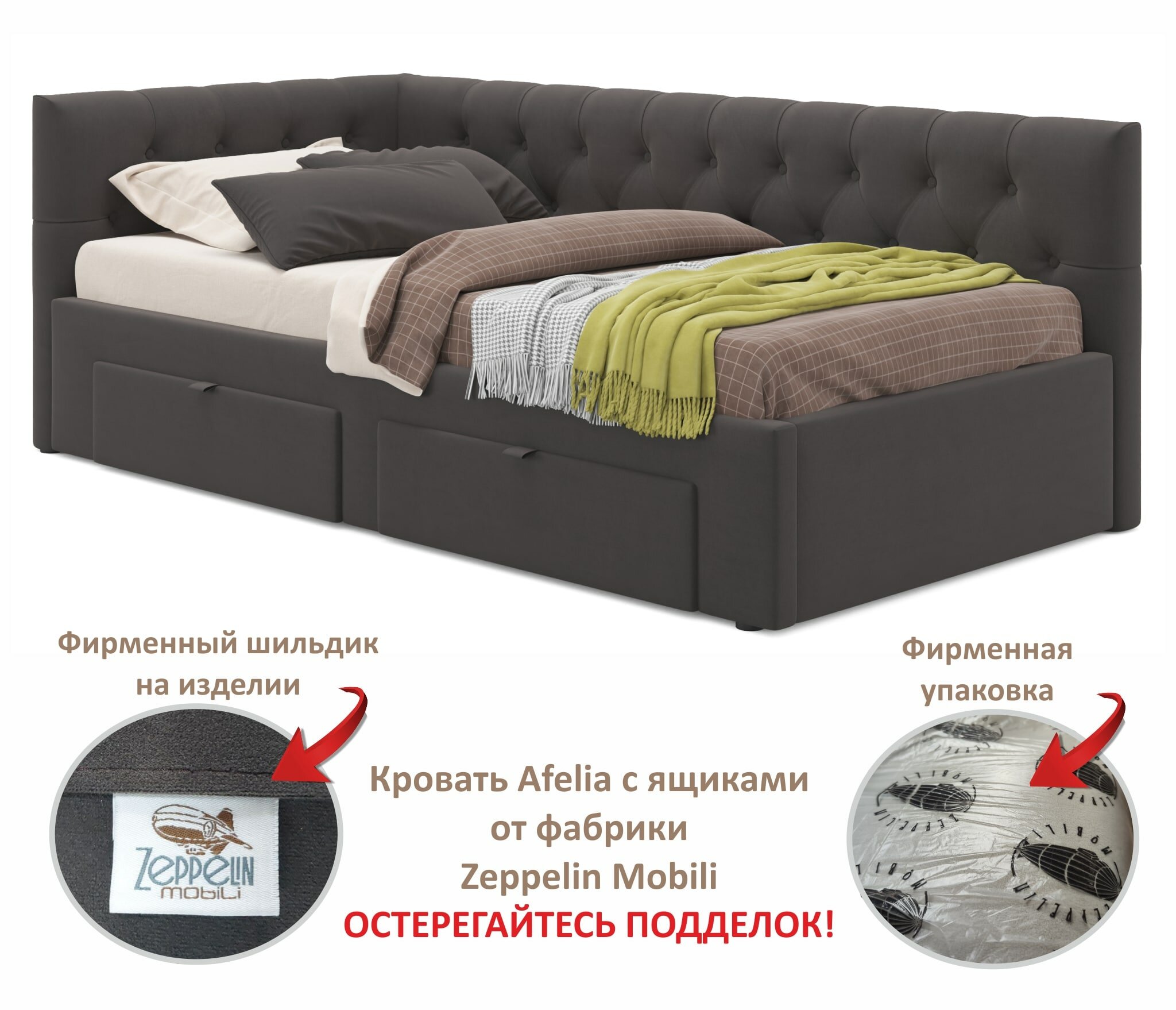 Односпальная кровать-тахта угловая Afelia 900 темная Zeppelin ортопед 90х200, из велюра, с ящиками