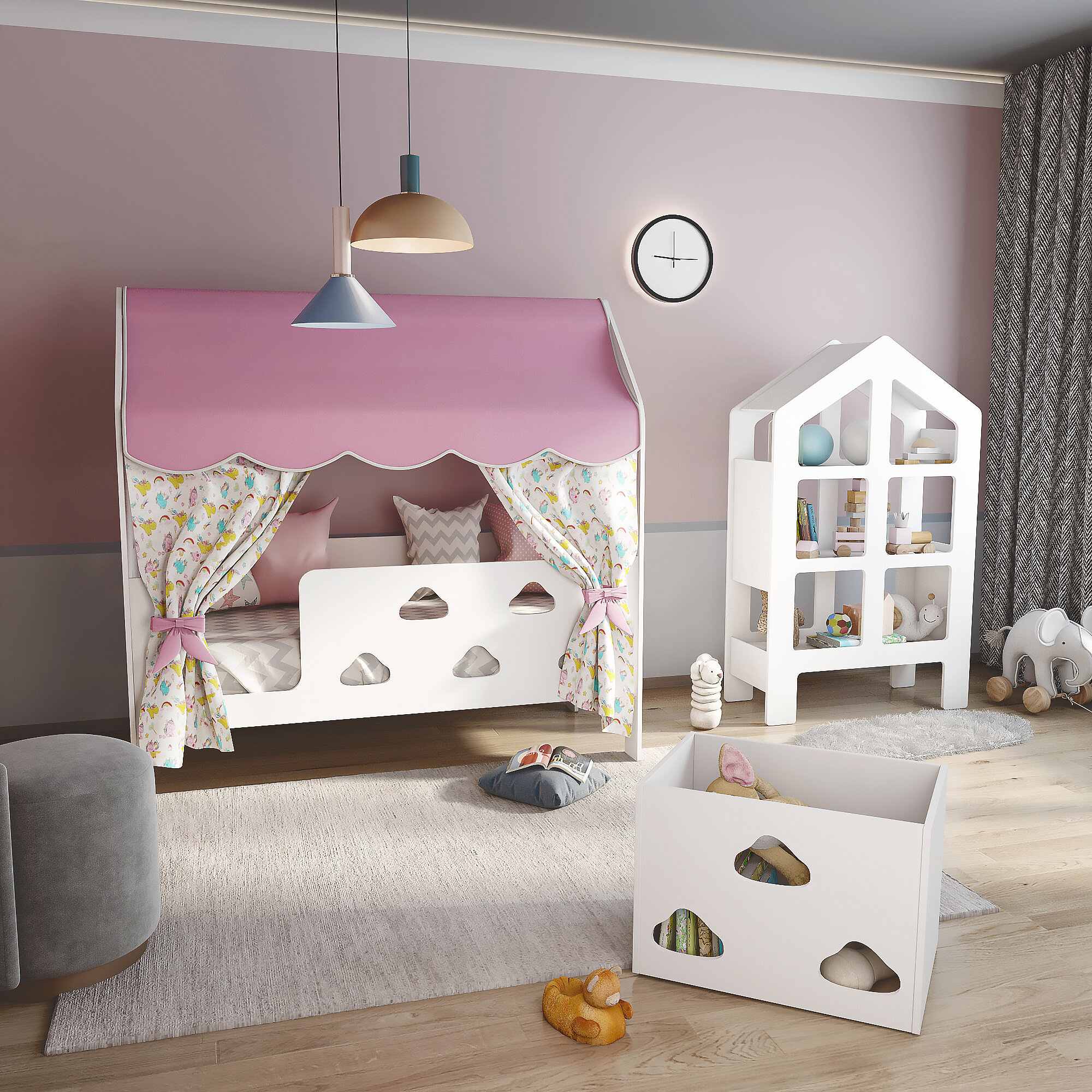 СохранитьКровать детская домик "Облачка" с текстилем (розовый, с единорогами, вход слева) интересное: