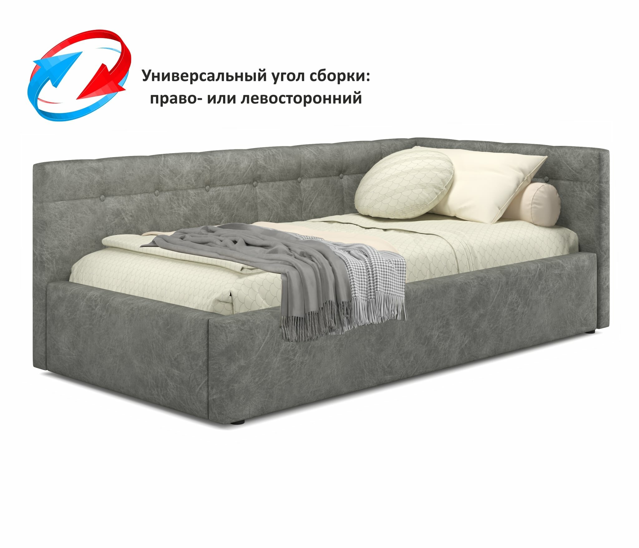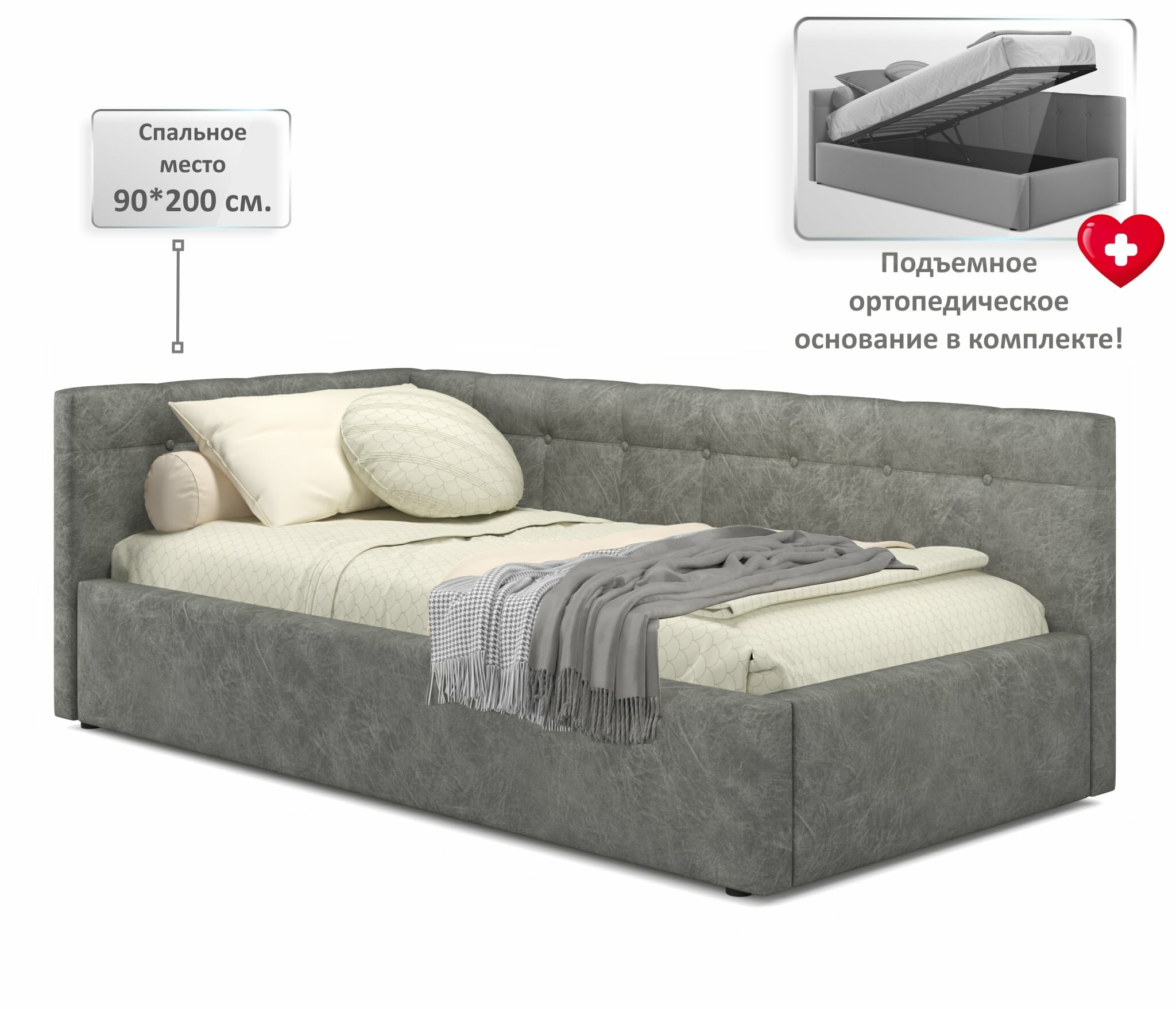 Односпальная кровать-тахта Bonna 900 кожа серый угловая Zeppelin, с подъемным механизмом, 90х200, мягкая из экокожи, с ящиком для хранения