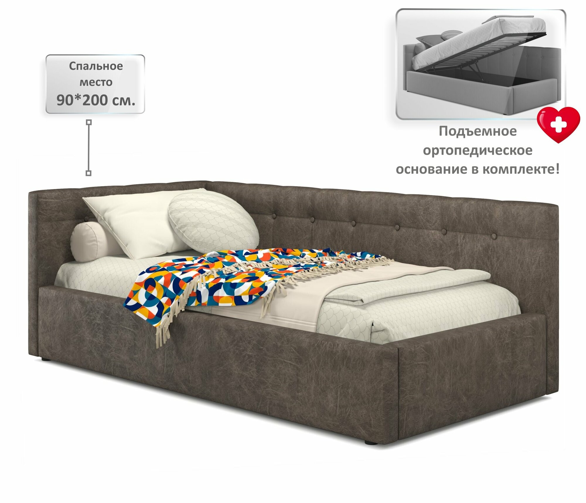 Купить Односпальная кровать-тахта Bonna 900 кожа брауни угловая Zeppelin, с подъемным механизмом, 90х200, мягкая из экокожи, с ящиком для хранения