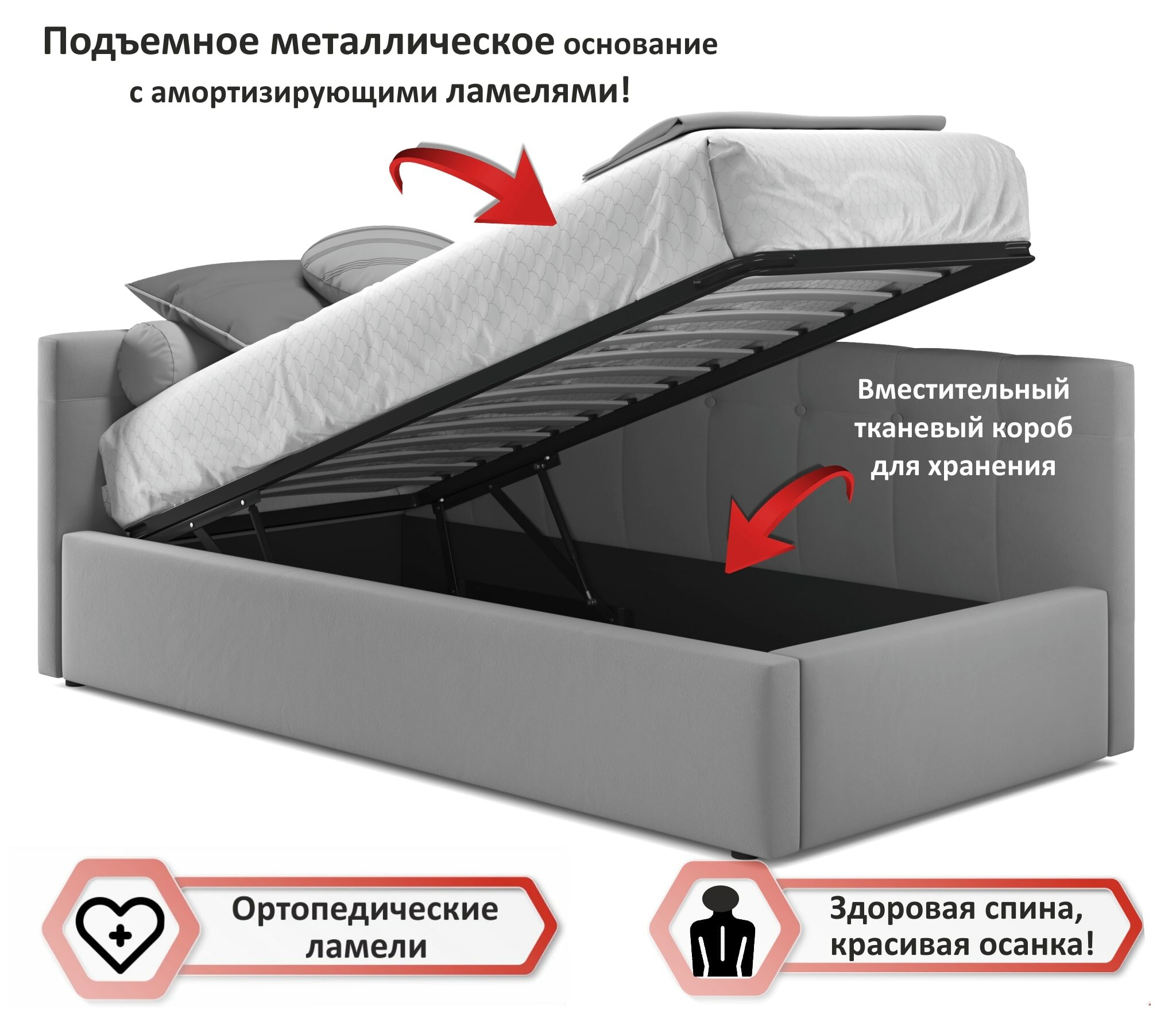 | Особенности | мягкое изголовье, основание под матрас, с изножьем, с подъемным механизмом, с ящиком для белья, усиленная конструкция |