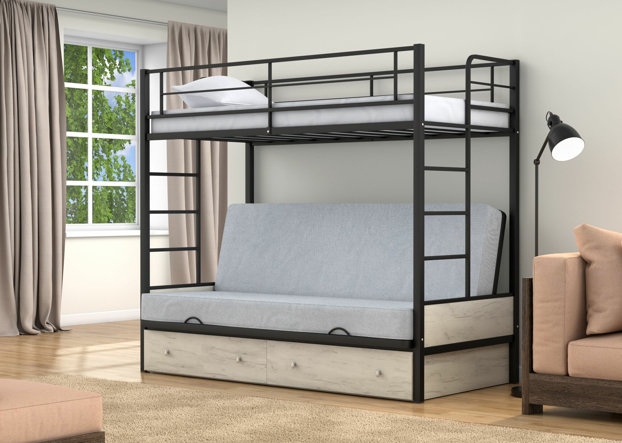 Купить Двухъярусная кровать-диван Дакар 1 Черный ящики Дуб крафт белый