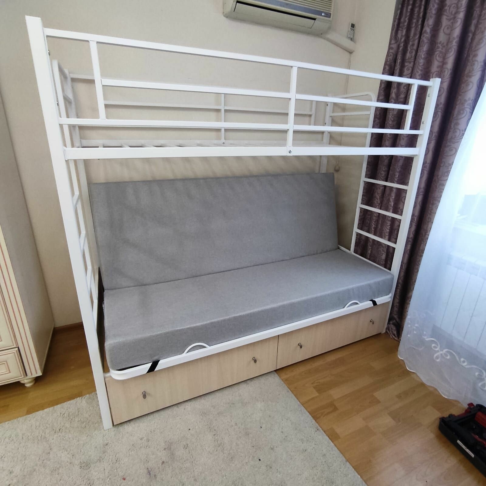 | Дополнительная информация | Нижний диван входит в стоимость изделия, наполнение ППУ 22й плотности, толщина 11 см. Обивка ткань рогожка. Верхний матрас не входит в стоимость и приобретается отдельно. Нижнее спальное место в разложенном виде 126х190 см, верхний ярус 90х190 см. |