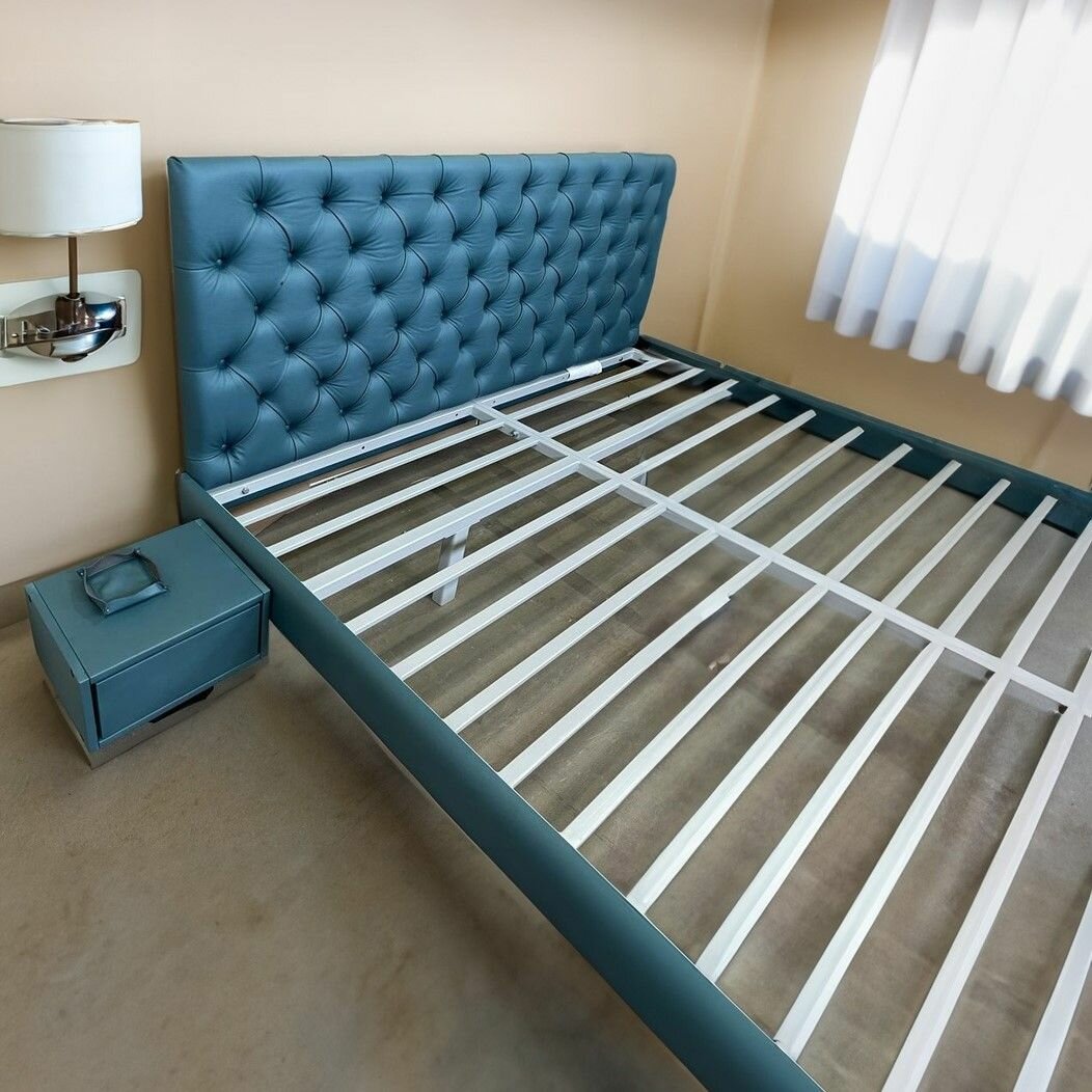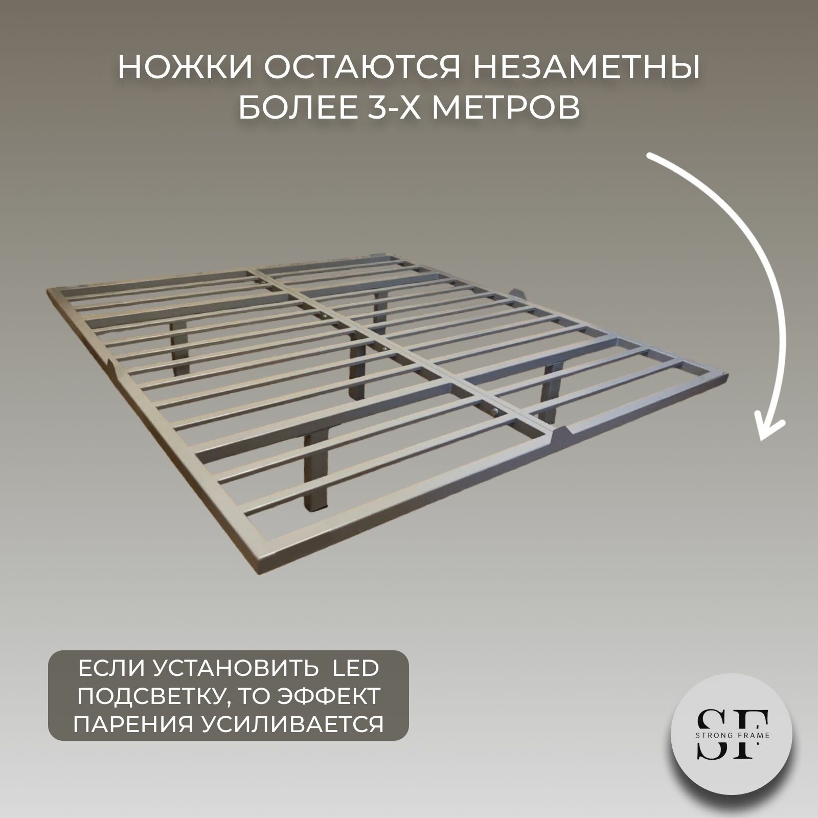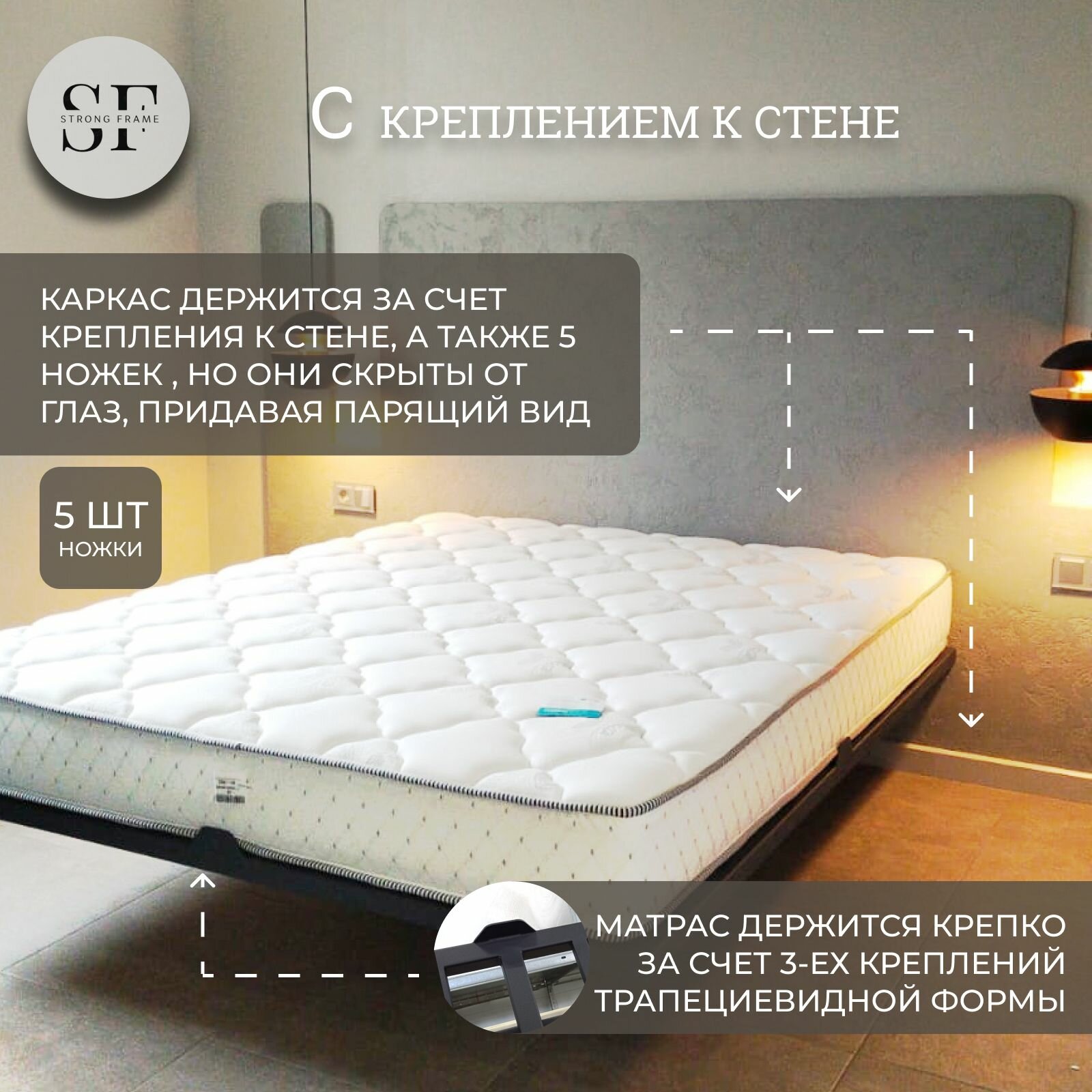 Парящая двуспальная кровать 200х200 см. Белый металлический каркас - основание с креплением к стене, 5 ножек интересное: