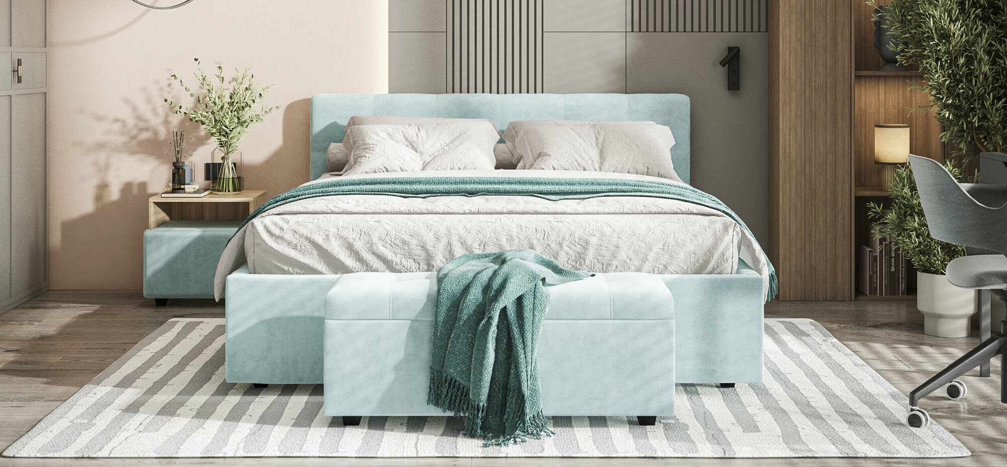 Кровать с ящиками 1800 с двумя тумбочками Камелия, цвет дуб сонома, ШхГхВ 296х217х78,2 см, спальное место 1800х2000 мм, без матраса, основание есть