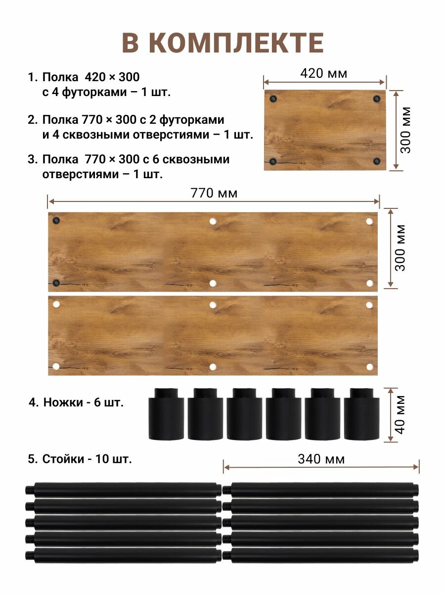 | Комплектация | 3 полки из ЛДСП 16 мм, стоек 10шт, ножки пластиковые 6шт, инструкция по сборке 1шт |