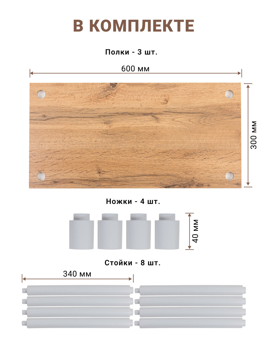| Дополнительная информация | Полка ЛДСП с 4 футорками - 1 шт.; полка ЛДСП с 4 сквозными отверстиями - 2 шт.; стойка пластик - 8 шт.; ножка пластик - 4 шт.; инструкция по сборке |