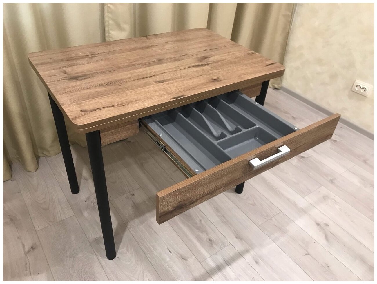 Стол обеденный раздвижной с ящиком для посуды 90 см на 60(120) см коричневый интересное: