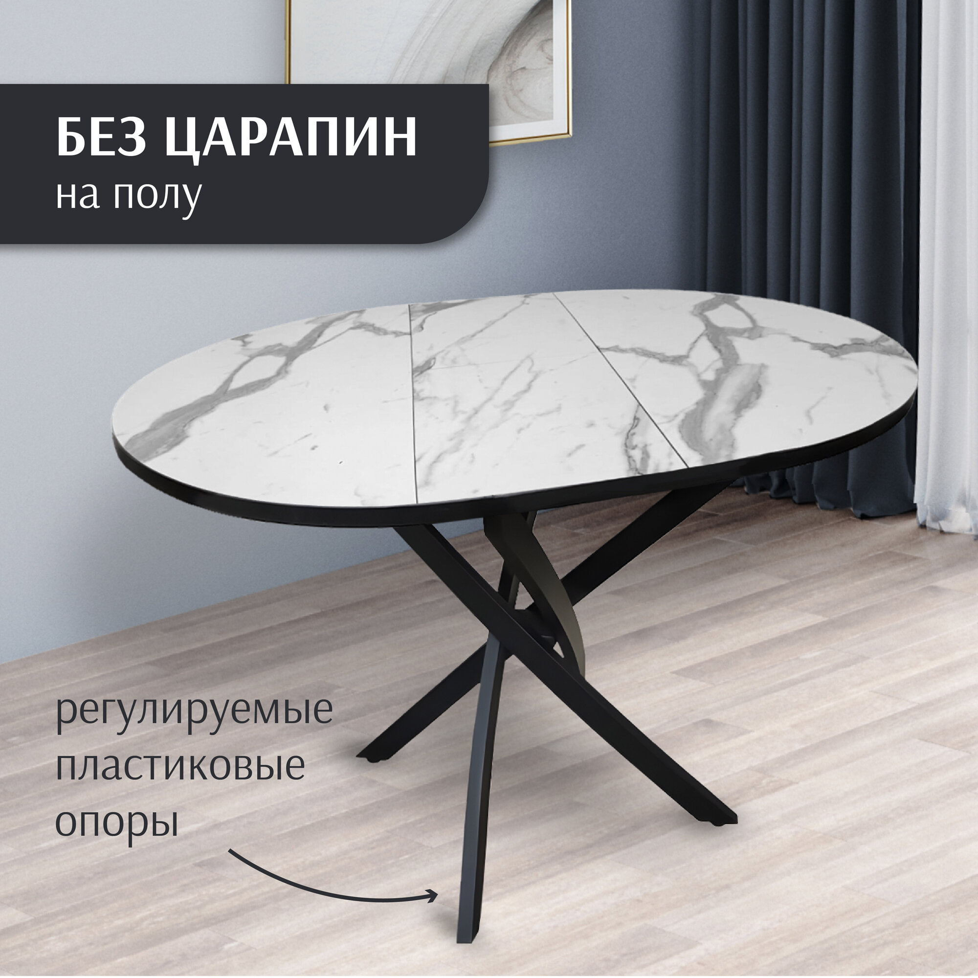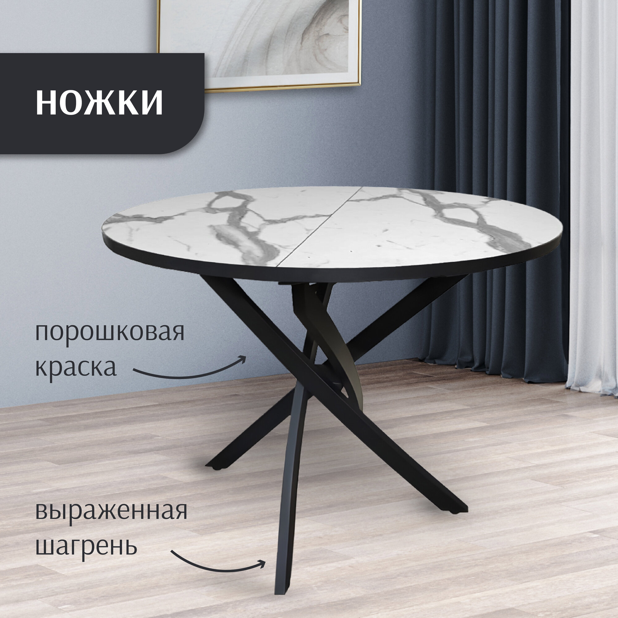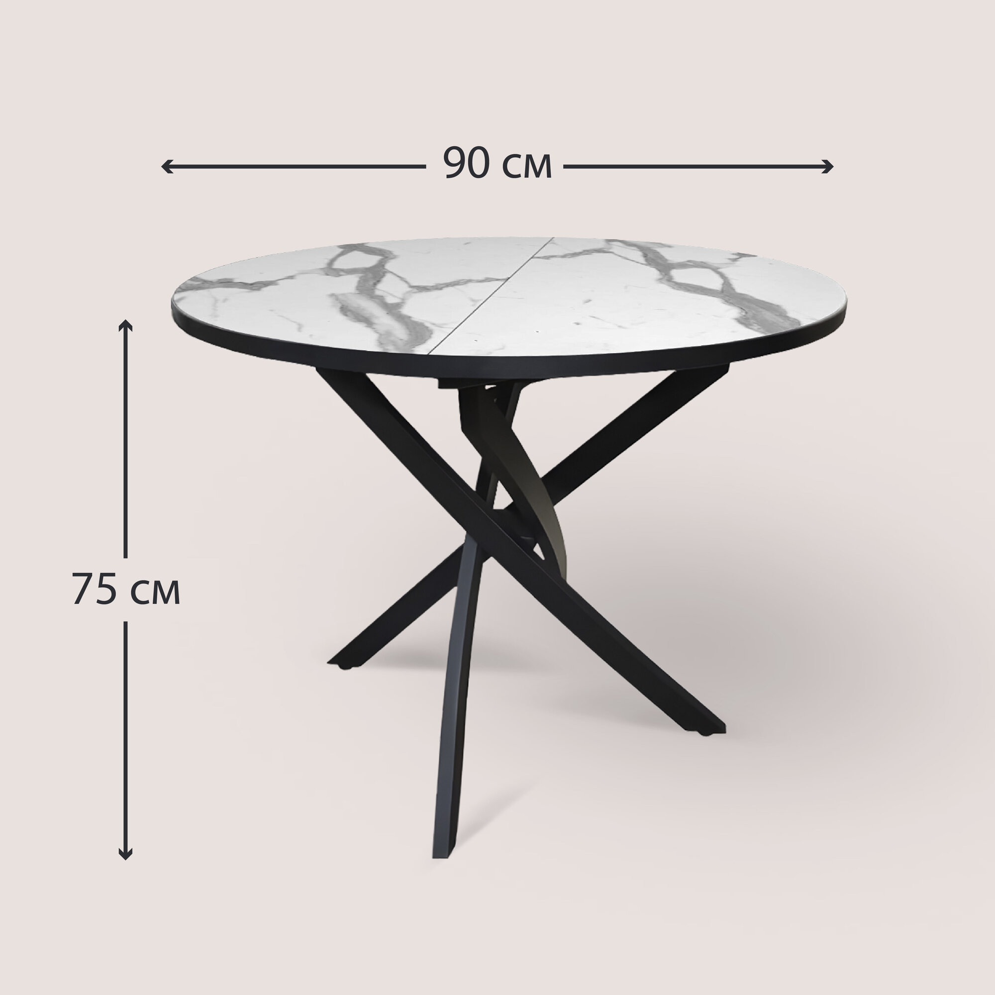 Стол круглый обеденный раздвижной белый мрамор, черный 90(120)х90х75