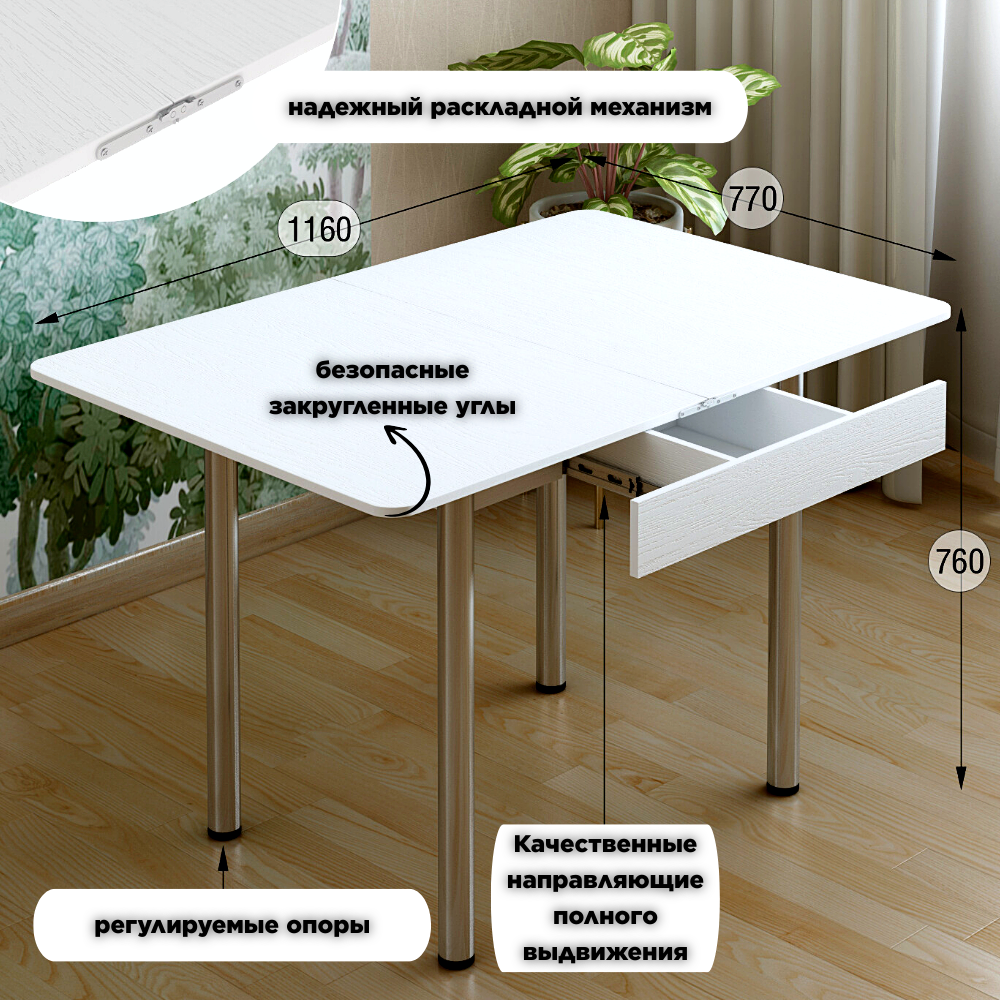 Кухонный стол раскладной для кухни, столовой, дачи и дома, ЛДСП, с ящиком, размеры 77х58 см, высота 76 см, ясень анкор белый