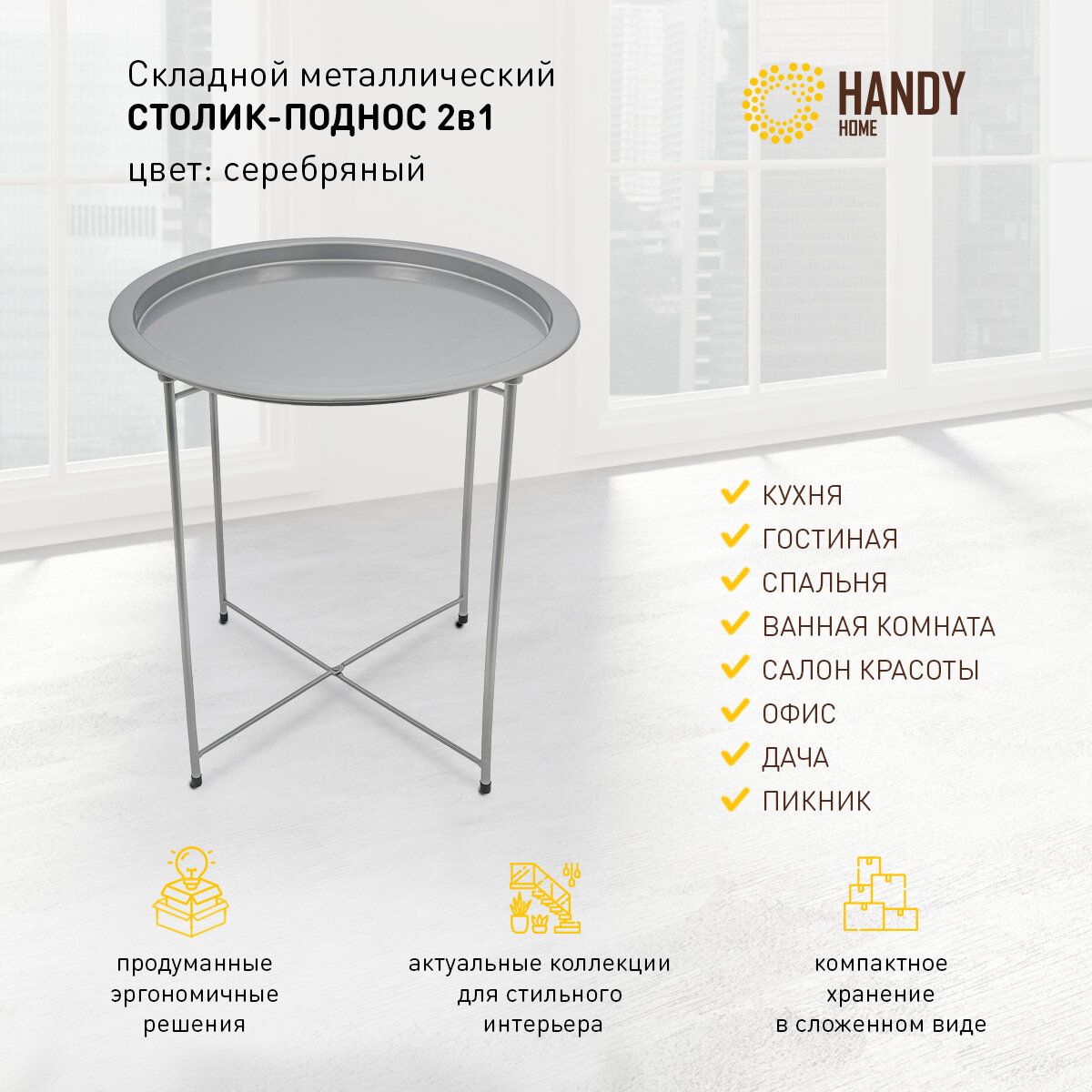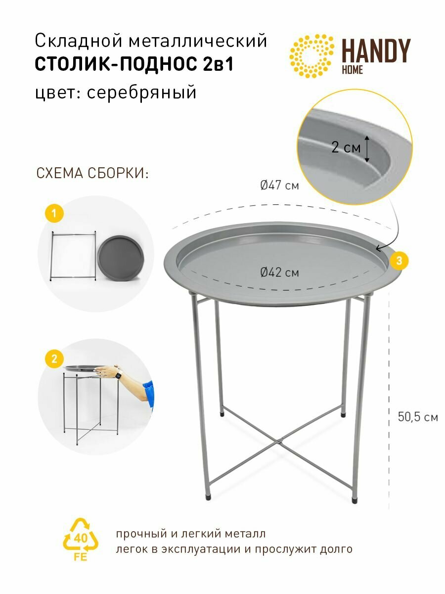 Круглый журнальный стол Handy Home / Съемный поднос на ножках / Цвет серебряный интересное: