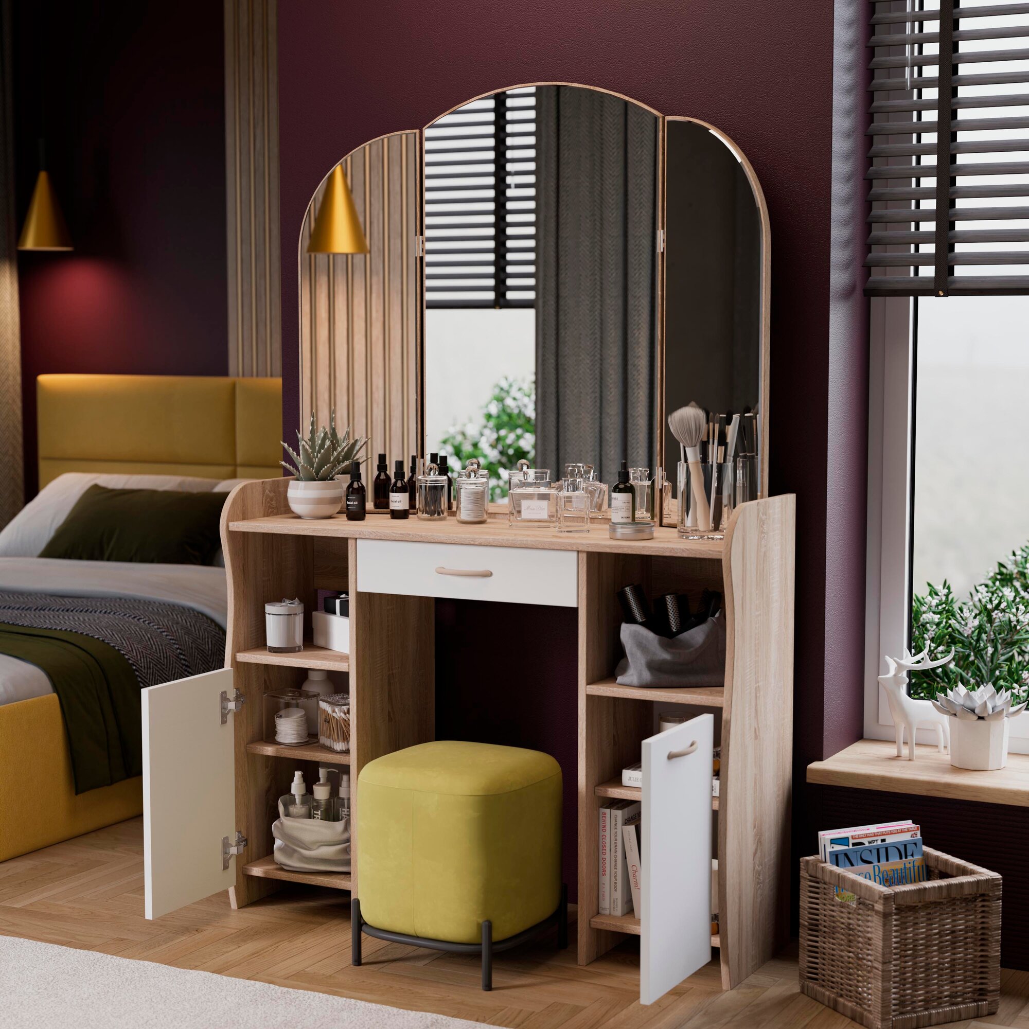 Купить Туалетный столик, трюмо, гримерный столик с ящиком и полками бежевый дуб (ВхДхГ) 162х107х33, София Т2