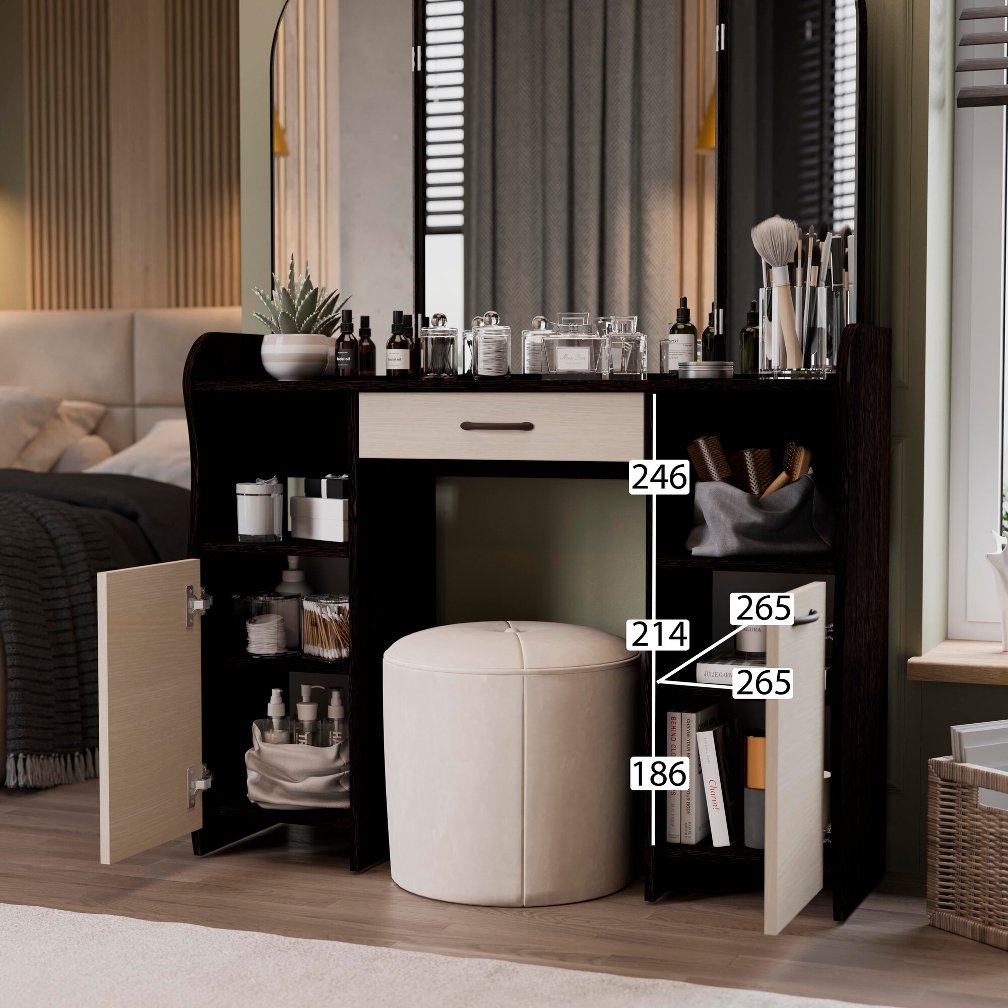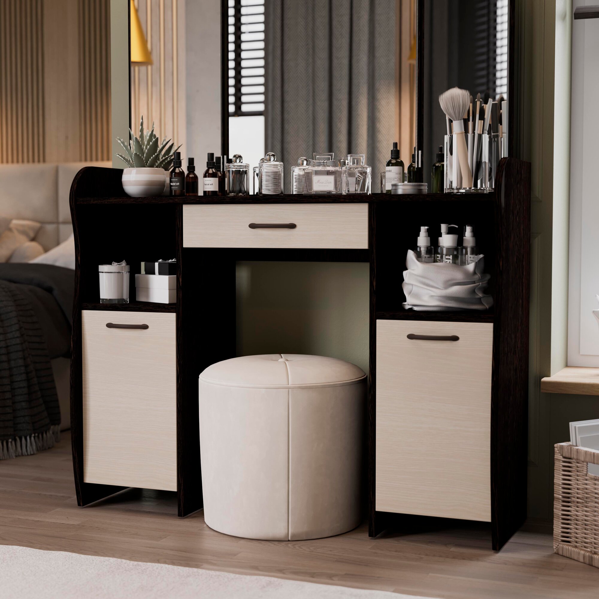 Туалетный столик, трюмо, гримерный столик с ящиком и полками бежевый дуб (ВхДхГ) 162х107х33, София Т2