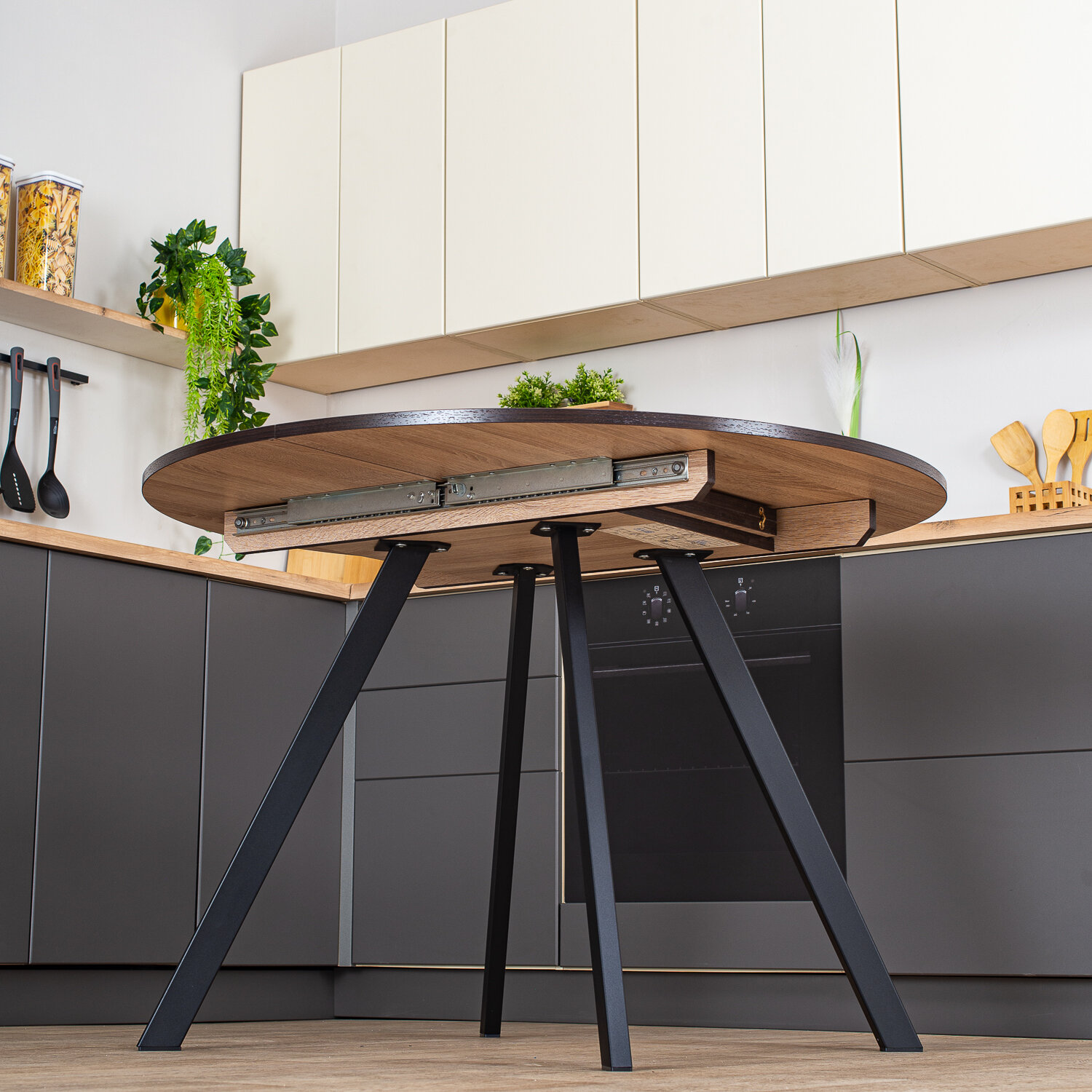 Стол круглый кухонный раздвижной Вита К СБ 95 ЧР, столешница ЛДСП, раскладной, серый, черный