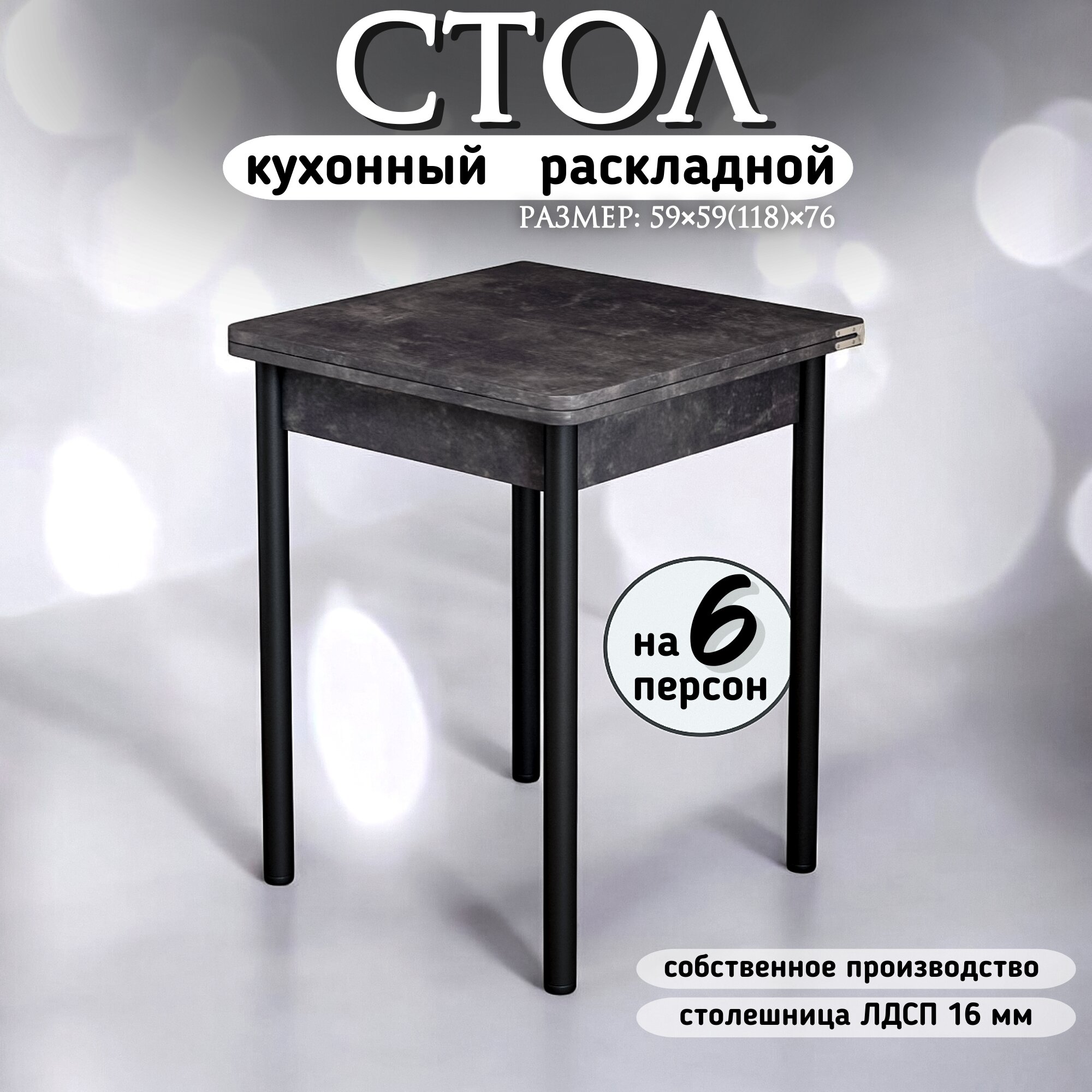Стол обеденный раскладной для кухни, столовой, дачи и дома, ЛДСП, с металлическими ножками, размеры 60х60 см, высота 76 см, КЕА, цвет Слейт черный