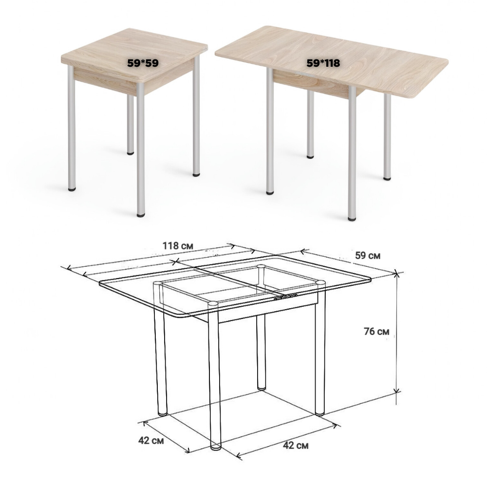 Стол обеденный раскладной для кухни, столовой, дачи и дома, ЛДСП, с металлическими ножками, размеры 60х60 см, высота 76 см, КЕА, цвет Хайвей