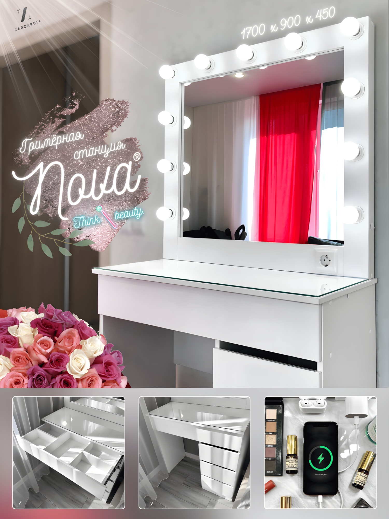 Ниже Вы можете прочитать отзывы на Туалетный столик с гримерным зеркалом и подсветкой, гримерный стол "Nova", ознакомится с подробными характеристиками, посмотреть интересные обзоры и фотографии на Туалетный столик с гримерным зеркалом и подсветкой, гримерный стол "Nova".