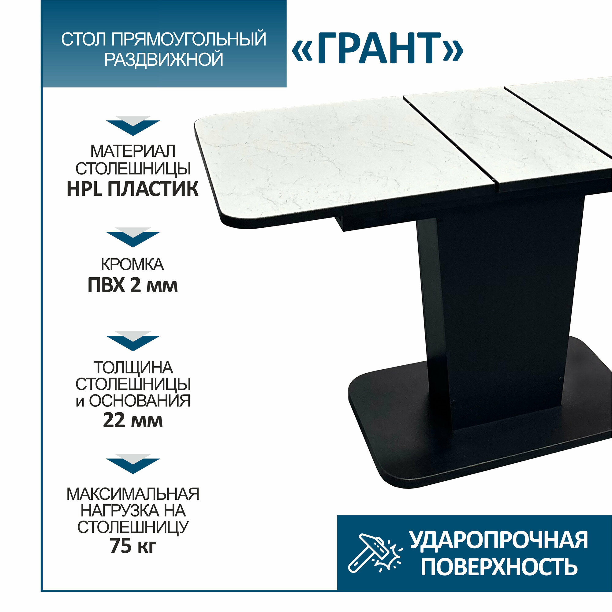Стол обеденный Астола "Грант", раскладной, ЛДСП, белый мрамор, 108х68х77 см