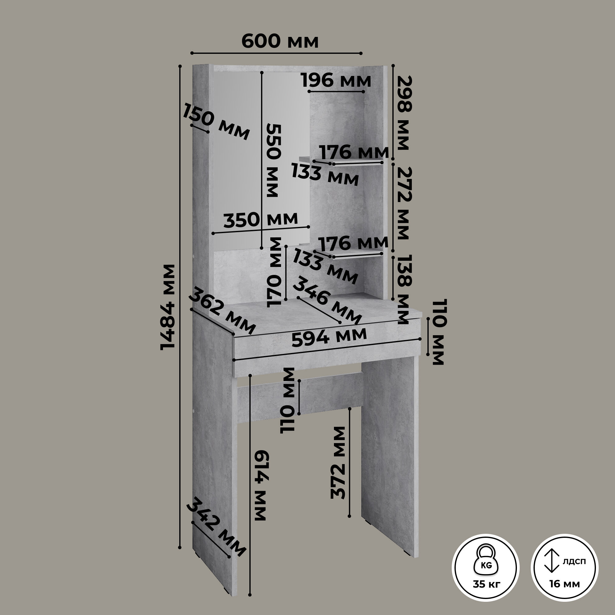 Ниже Вы можете прочитать отзывы на Туалетный столик с зеркалом для спальни гостиной детской Кео СТЛ-130 бетон, ознакомится с подробными характеристиками, посмотреть интересные обзоры и фотографии на Туалетный столик с зеркалом для спальни гостиной детской Кео СТЛ-130 бетон.