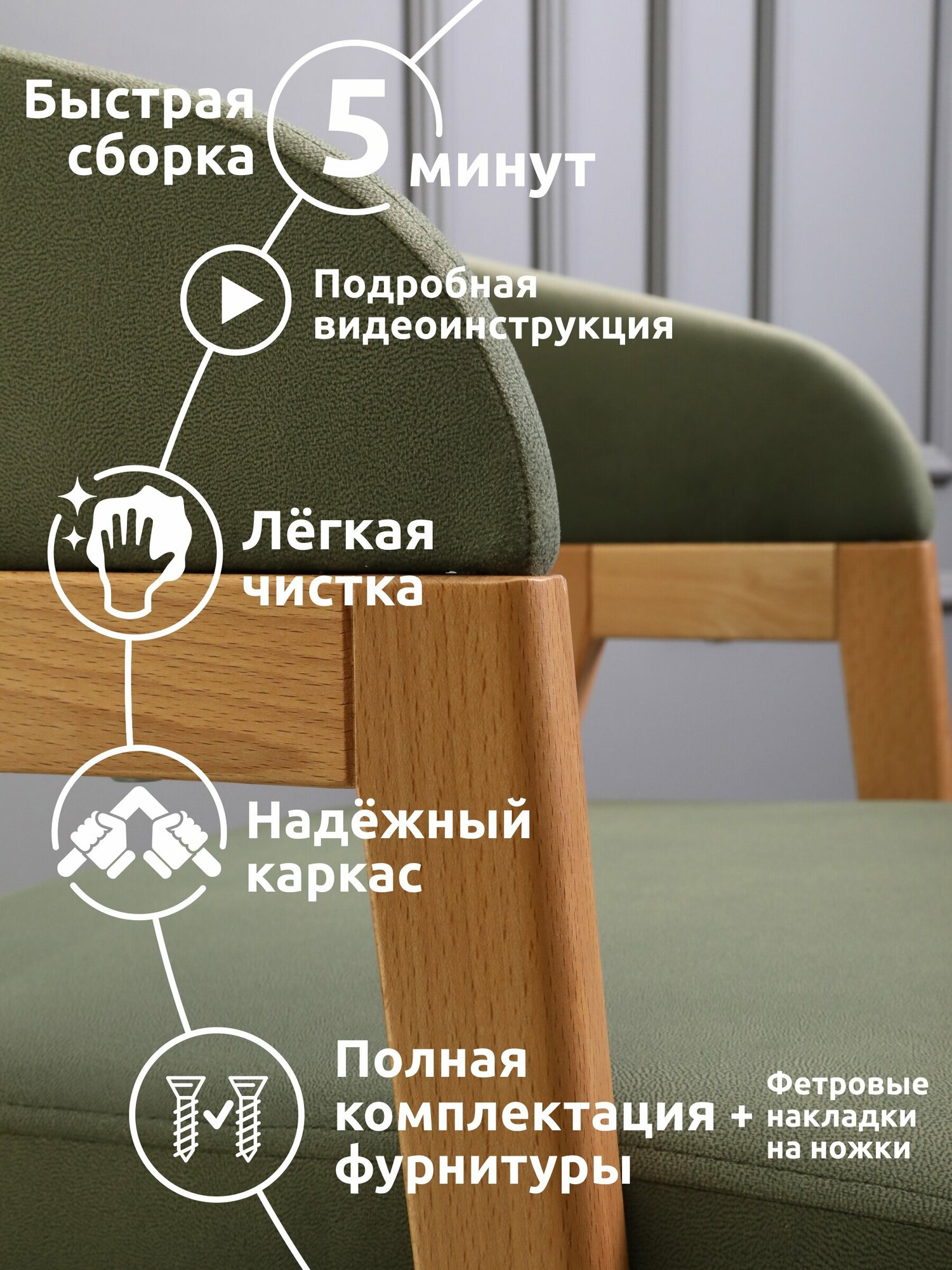 | Комплектация | Спинка, нога левая/правая, сиденье, винт М6х70 2 шт, винт М6х35 4 шт, шкант 8х30, шестигранник, фетровые наклейки 4 шт |