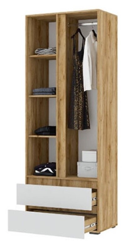 Распашной шкаф для одежды с ящиками, со штангой, с полками, 80х46х210 см, Белый / Дуб Крафт золотой, Хелен ШК 01