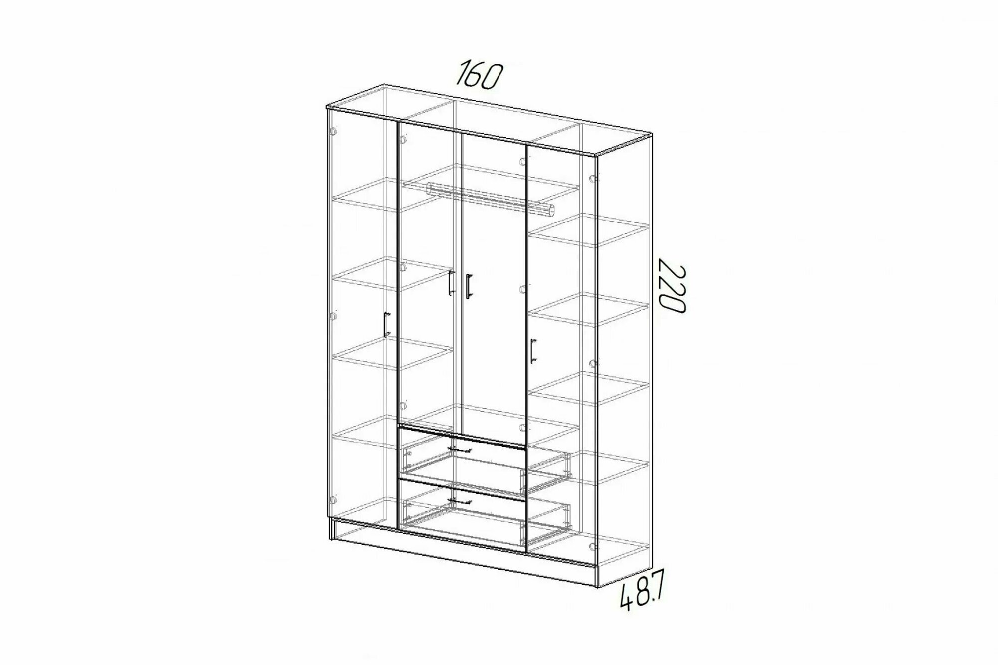 | Комплектация | Два отделения с полками ,одно отделение со штангой и нишей ,два выдвижных ящика. |