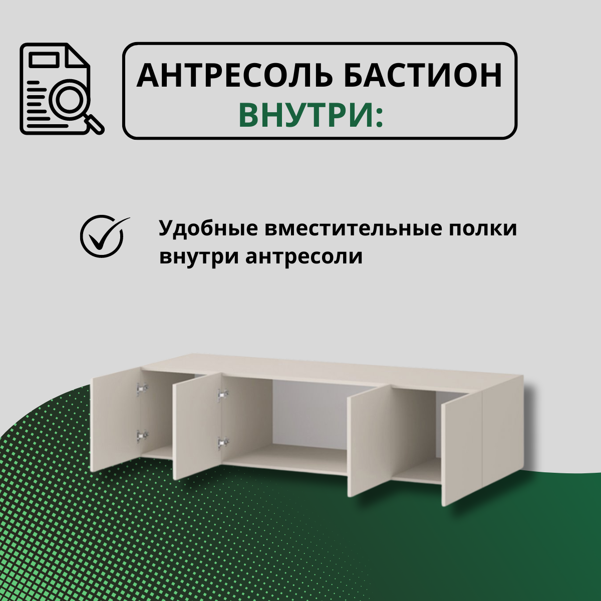 | Комплектация | антресоль с дверками без ручек, механизм нажимной |
