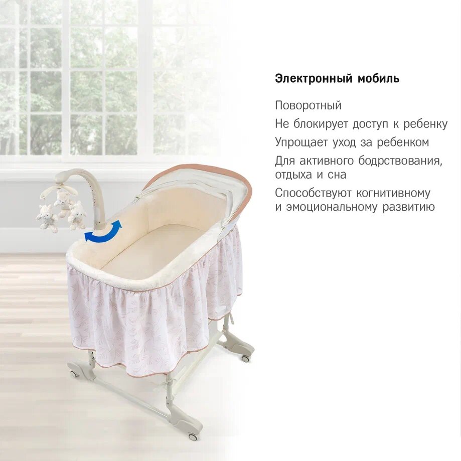 | Дополнительная информация | авто-укачивание от сети через адаптер, электронный мобиль работают от батареек; высота бортиков люльки 30 см; вес 9 кг |