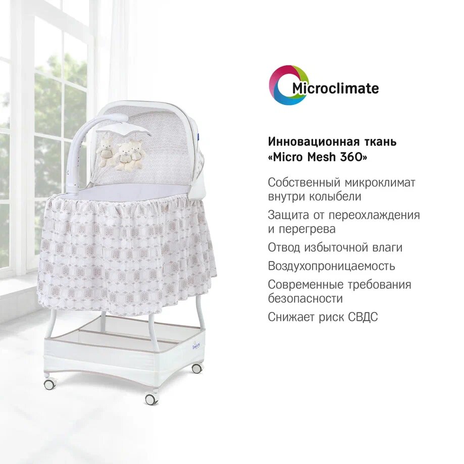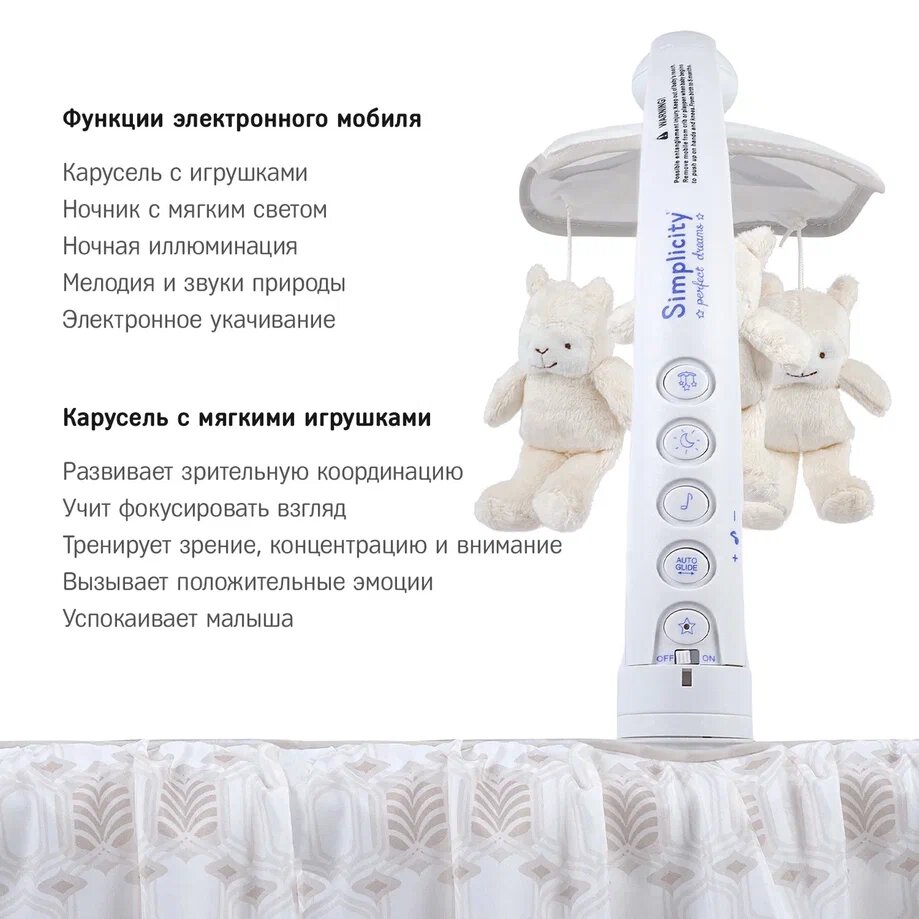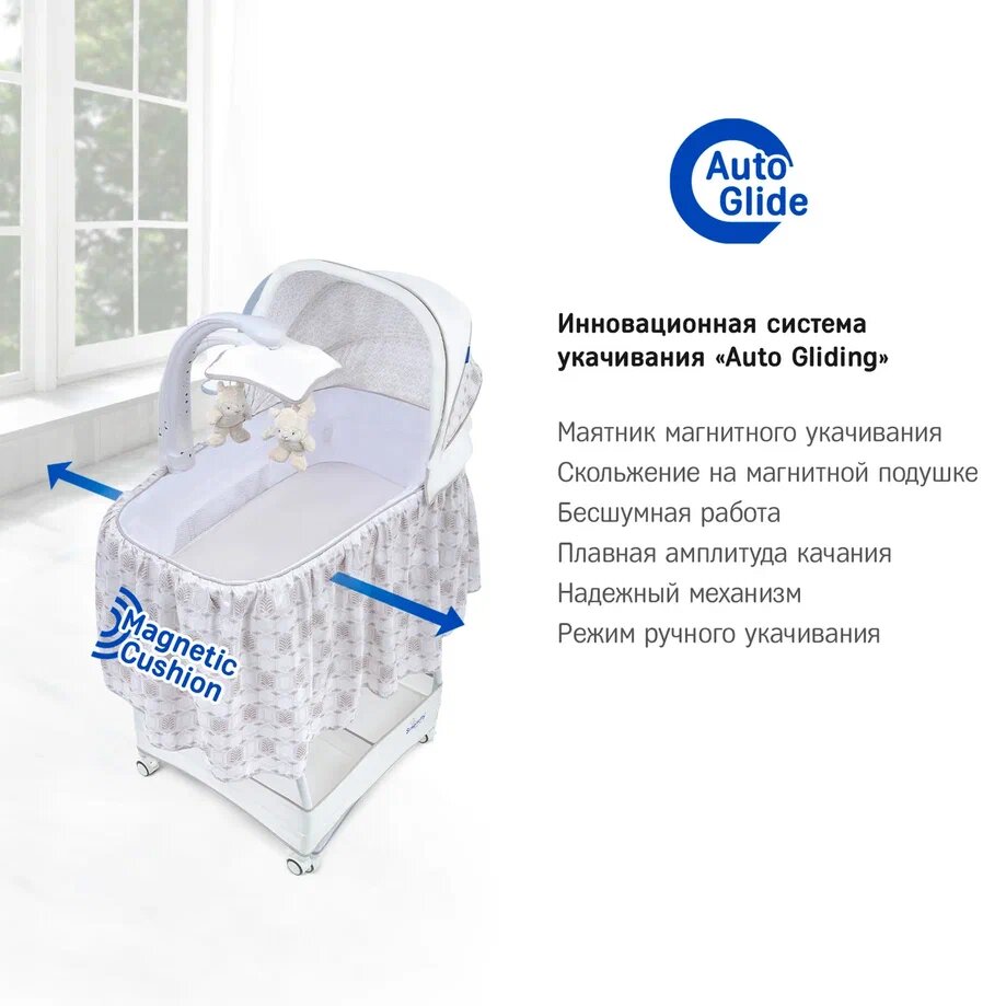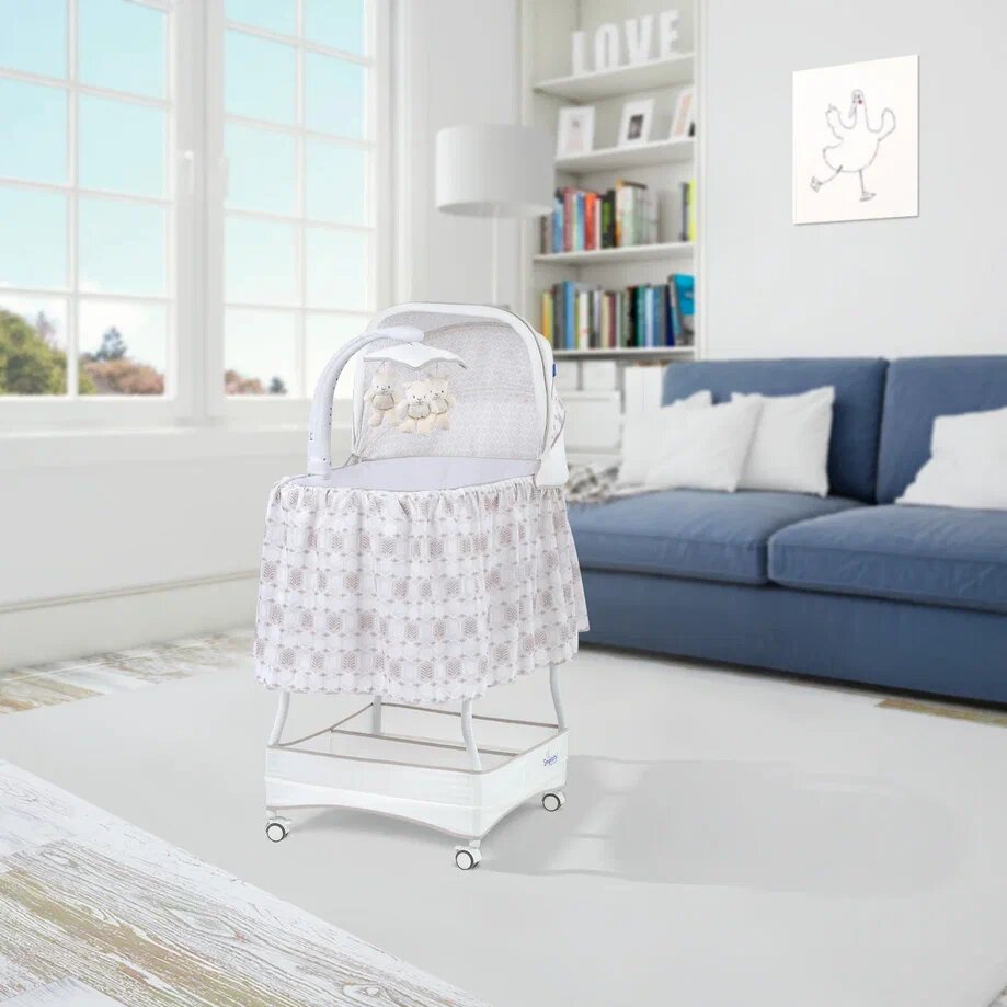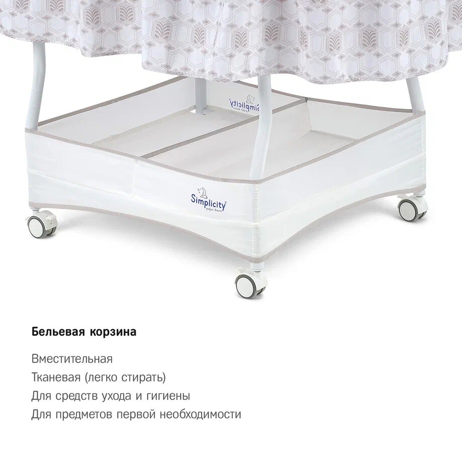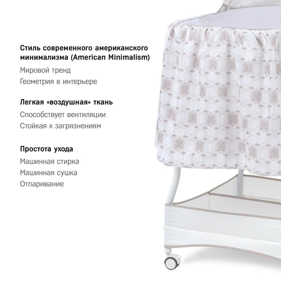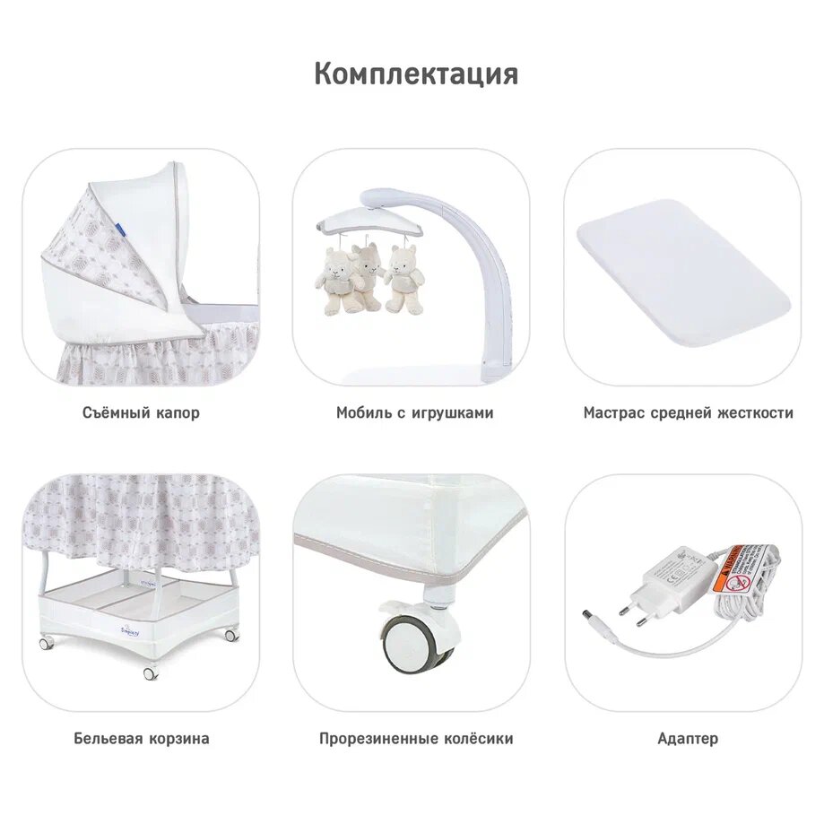 | Комплектация | колыбель / съёмный матрасик / наматрасник / капор / мобиль с игрушками / электрошнур с адаптером (американская вилка) / тканевая корзина для белья |