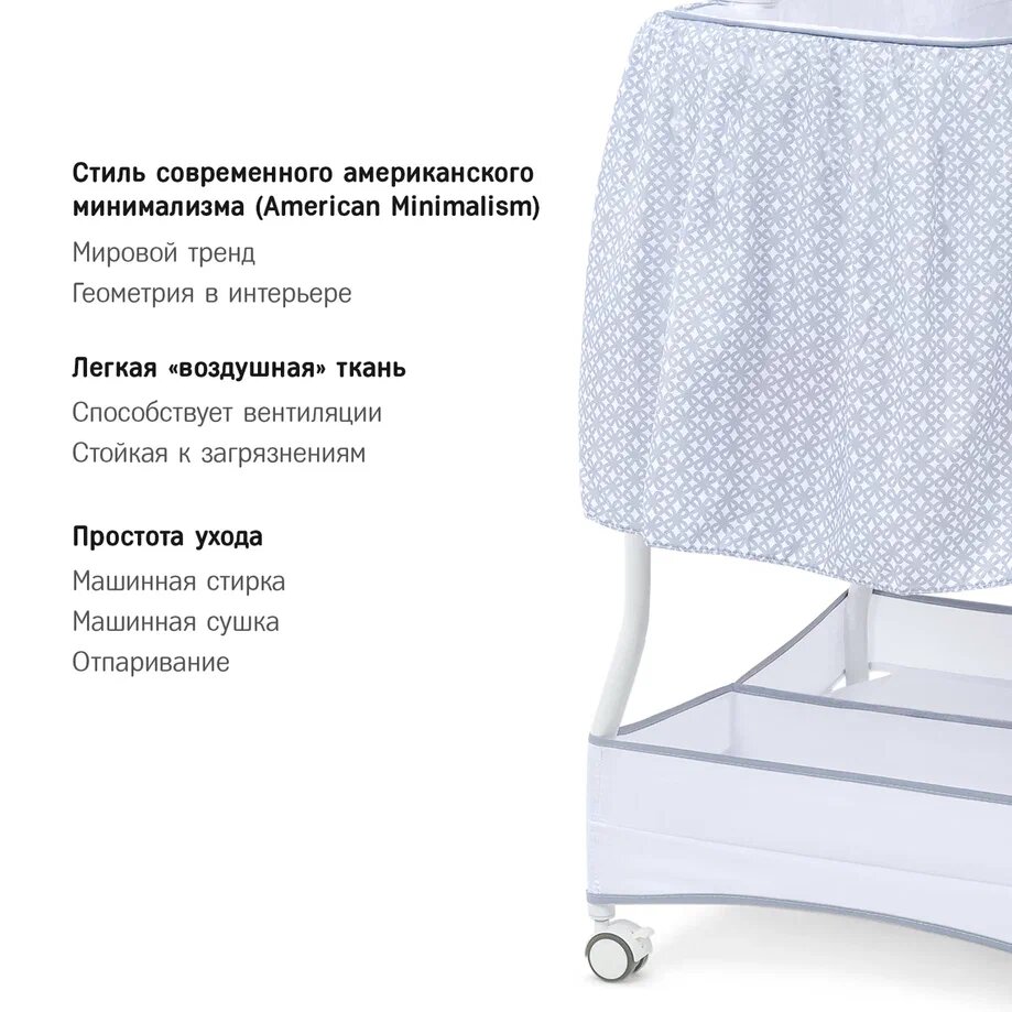 | Комплектация | колыбель / съёмный матрасик / наматрасник / капор / мобиль с игрушками / электрошнур с адаптером (американская вилка) / тканевая корзина для белья |