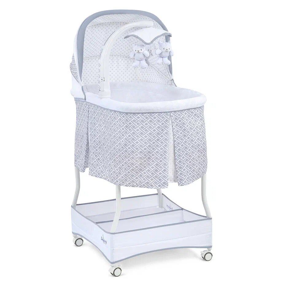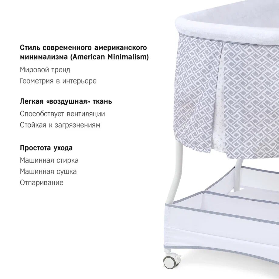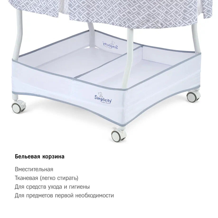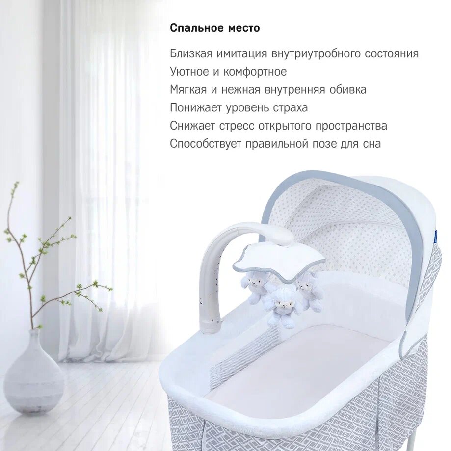 | Комплектация | колыбель / съёмный матрасик / наматрасник / капор / мобиль с игрушками / электрошнур с адаптером (американская вилка) / тканевая корзина для белья |