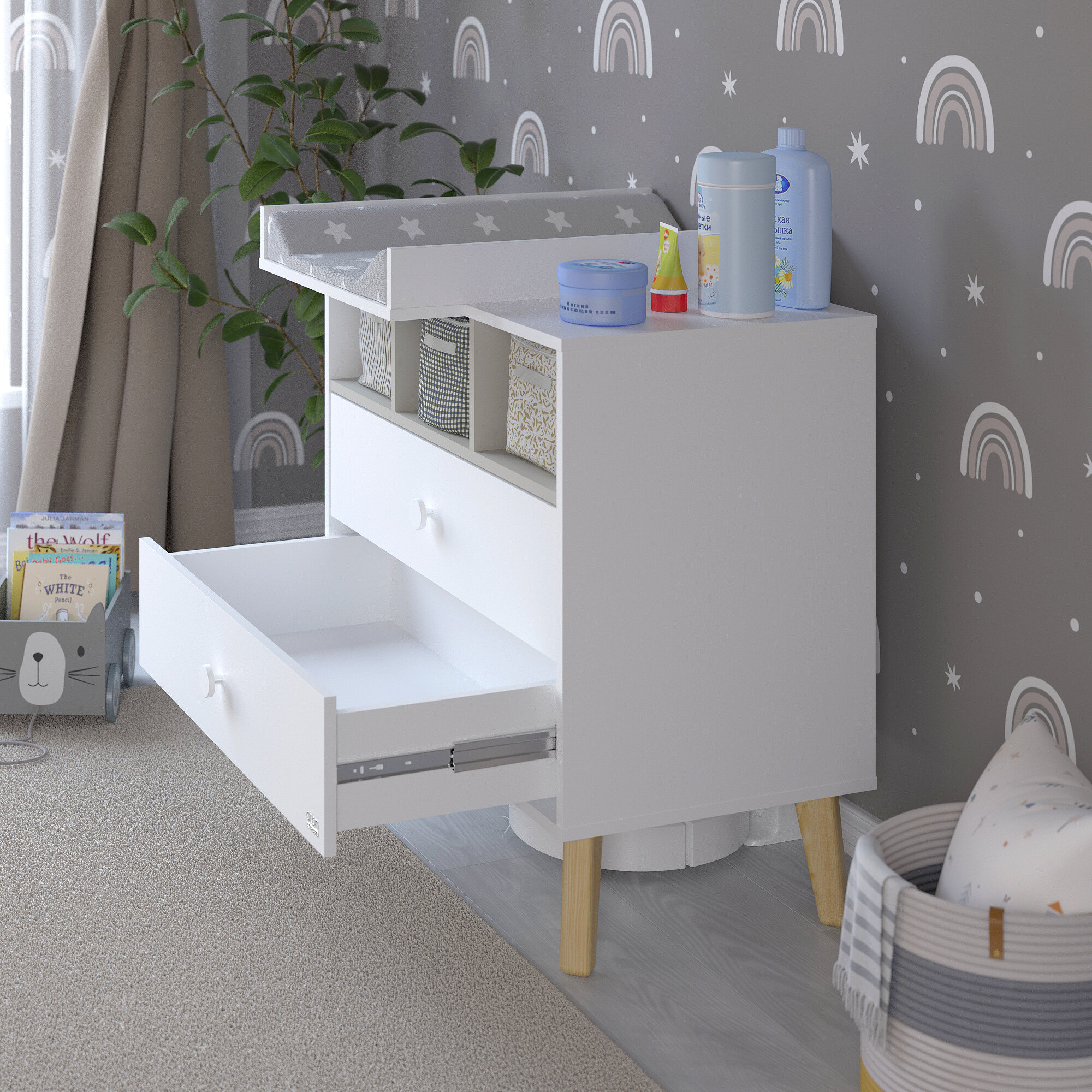 | Дополнительная информация | 3 положения съёмного пеленального столика, телескопические направляющие ящиков |