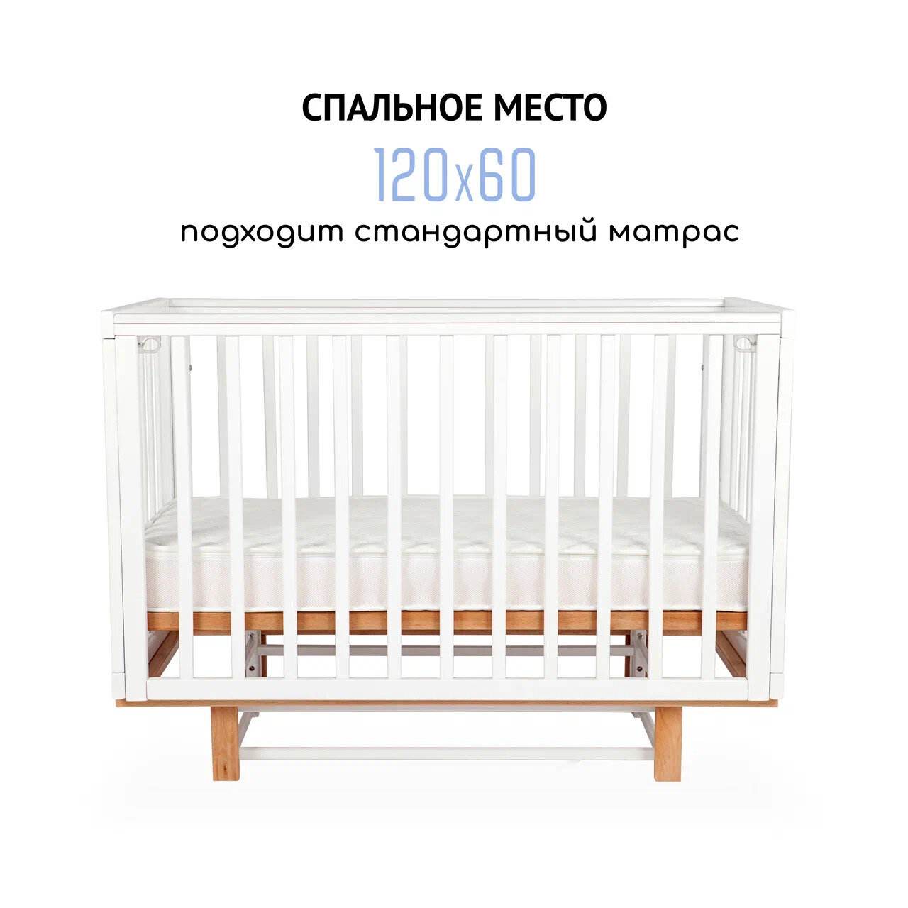 | Особенности | • Расстояние от дна до верха кровати: 36 см (1 уровень) / 45,5 см (2 уровень) / 55 см (3 уровень) • Расстояние между рейками 7,3 см • Маятниковый механизм продольного качания • Силиконовые накладки (2 шт) • Съёмная боковина (приставная кровать) • Опускающаяся боковина |
